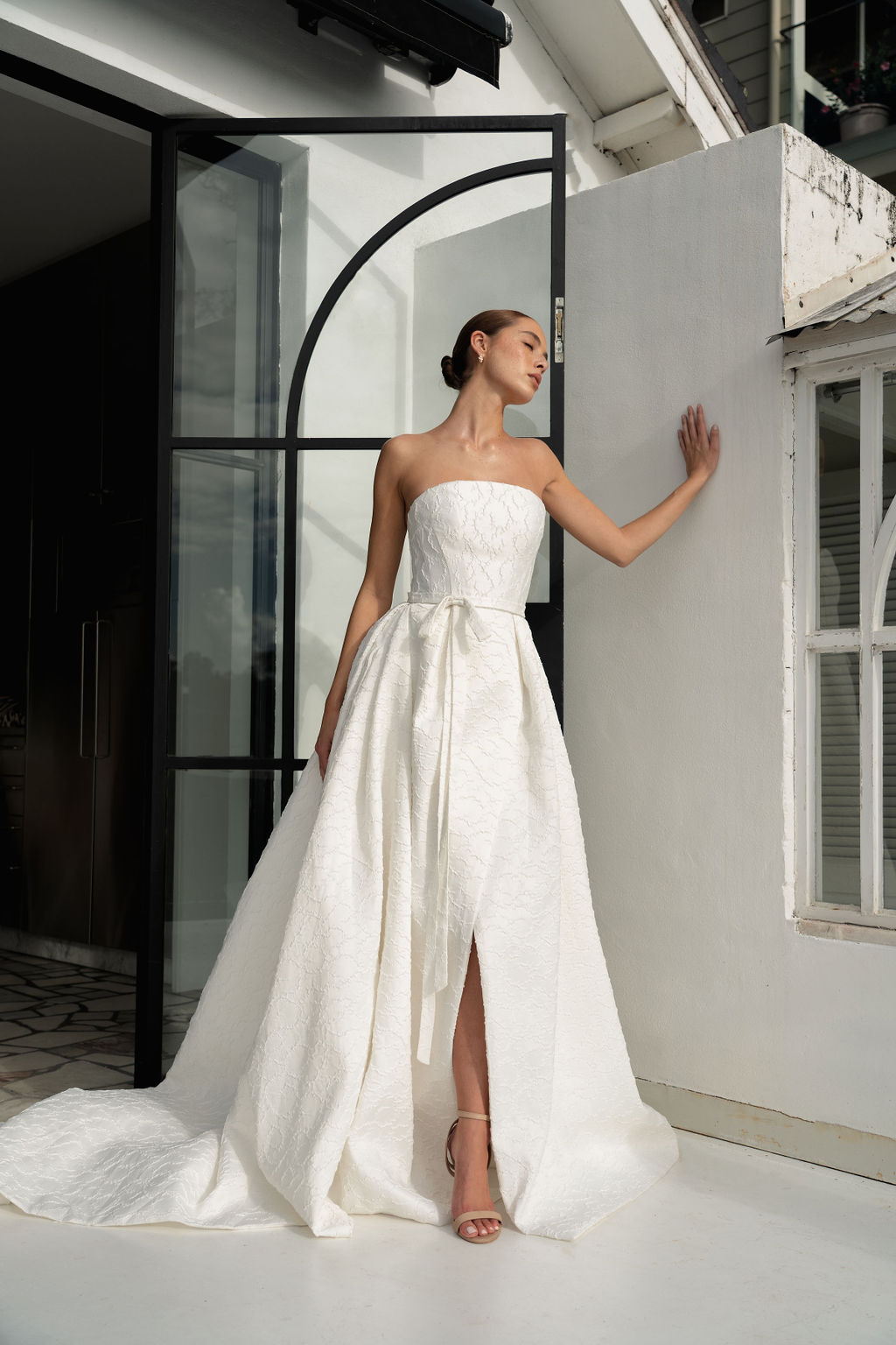 The next popular trend in bridal we are seeing are wedding gowns with leg slits. This is a fun trend that allows brides to not only have more mobility during their wedding day but to also show off their wedding shoes. Many of our styles can have slits added or removed based upon the brides desires.