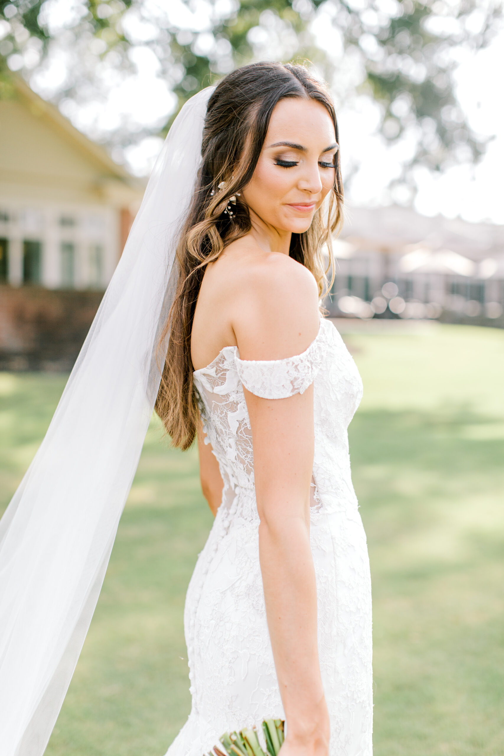 Emily said that wedding dress shopping at Annalise Bridal “was a very full circle moment”. Before starting to shop for gowns, she saw the Walton dress by Anne Barge on their website and immediately sent it to our owner, Lindsey, to ask about borrowing it for her appointment. “It was the very first dress I tried on” and after taking a few weeks to think, she tried it again and decided it was the one! She just loved the lace off the shoulder look, and it went perfectly with her classic and timless theme!