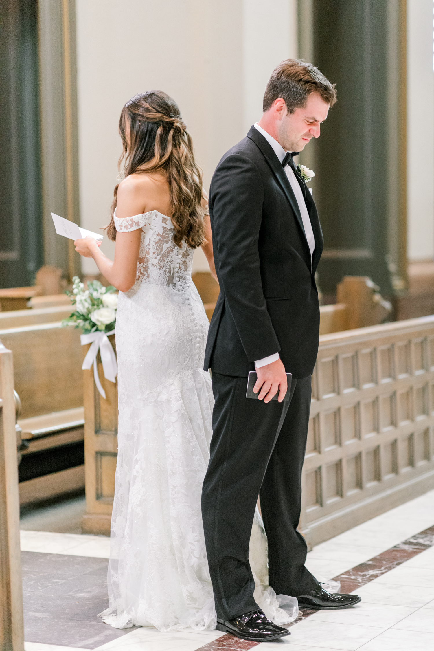 One of Emily’s favorite moments from her big day was doing a “first touch” with her husband, Kyle. Although she wanted to get photos in the church before the ceremony, “Kyle seeing me for the first time walking down the aisle was super important to him. Which I love and think is special!” So they did a first touch instead, where they exchanged personal vows while standing back to back in the church. “It was a beautiful moment and a great feeling to connect with each other prior to the ceremony.”