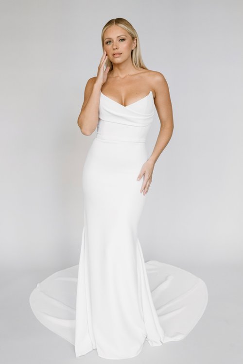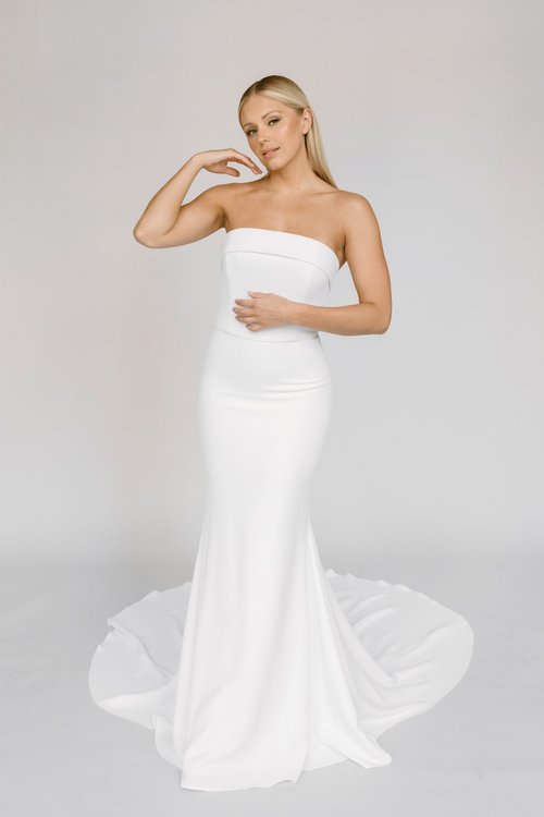 With a straight across bandeau neckline and boning for support, this crepe wedding dress with a long train offers drama and coverage.