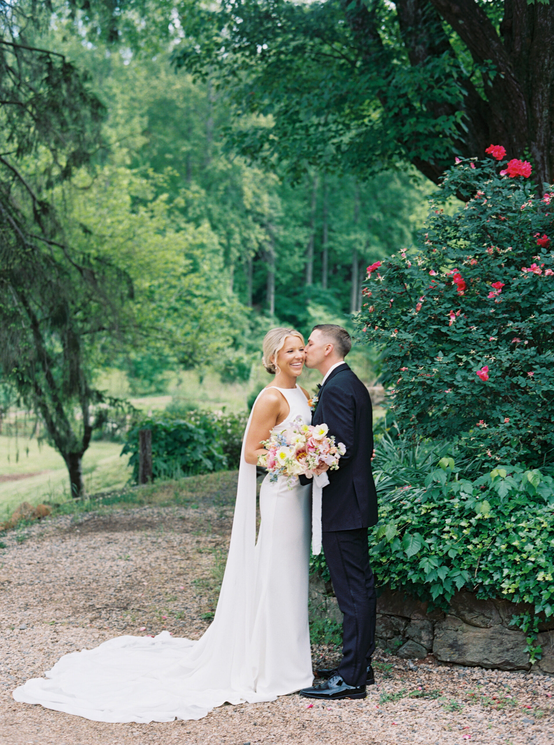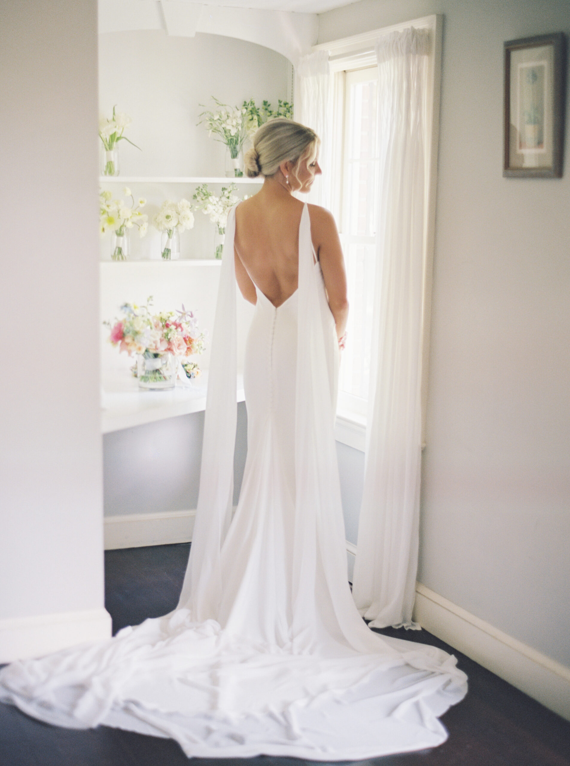 The bride chose “Parker” a French crepe high neck gown with plunging back and button detail. She added on tulle wings for an additional element to her garden party vision.