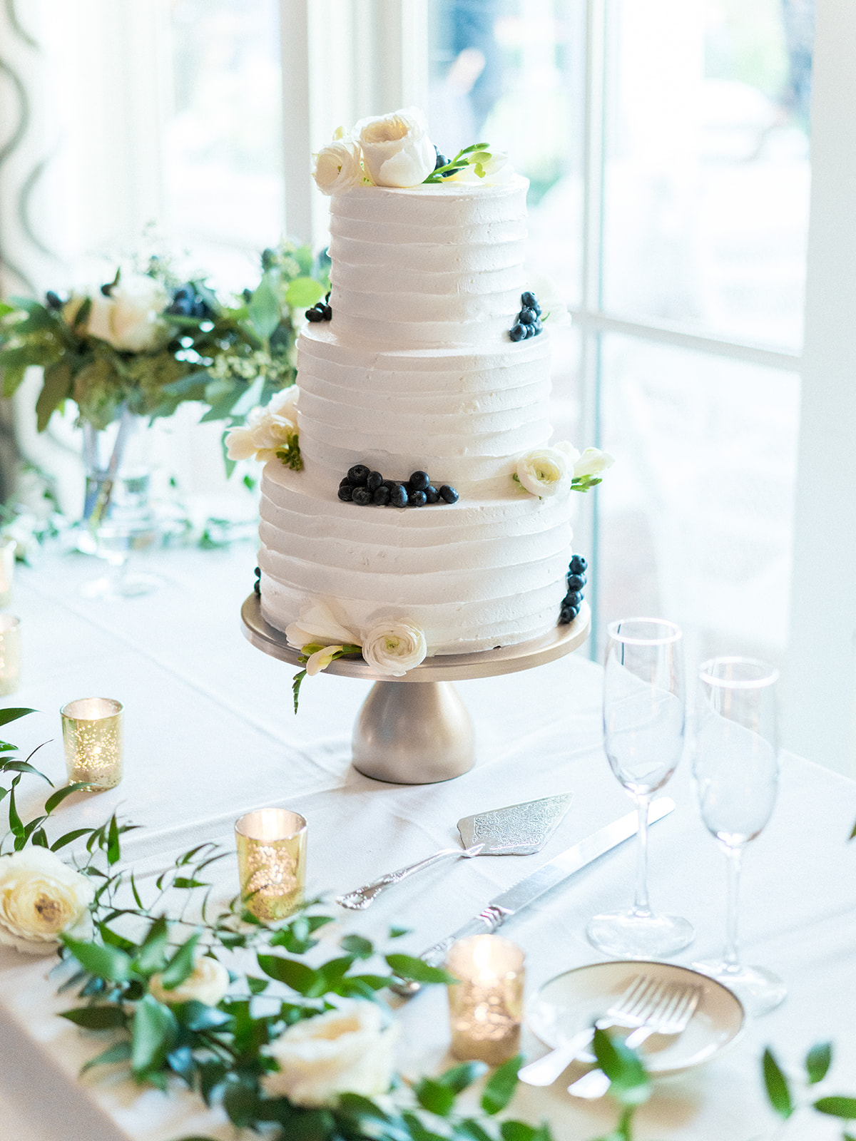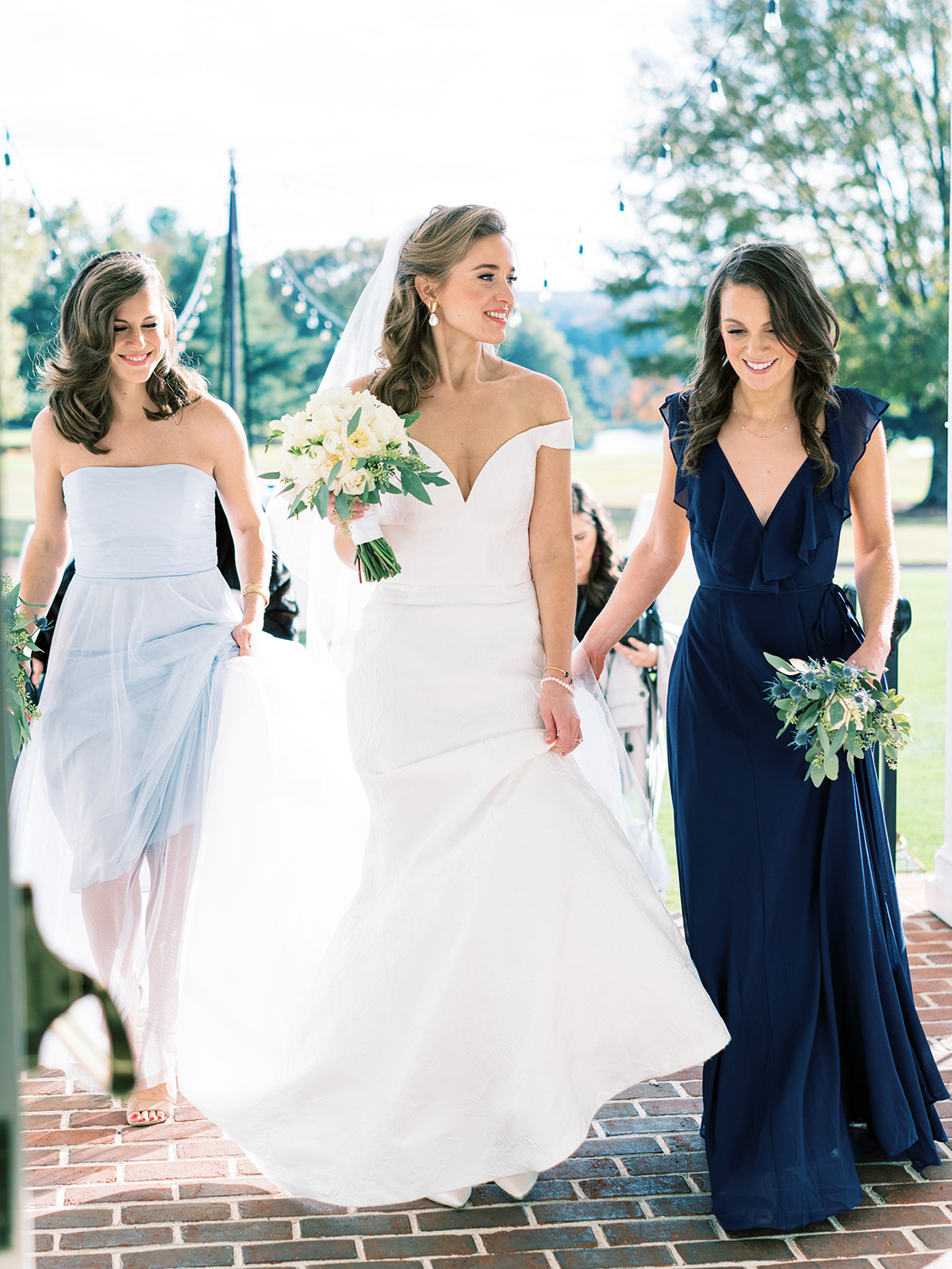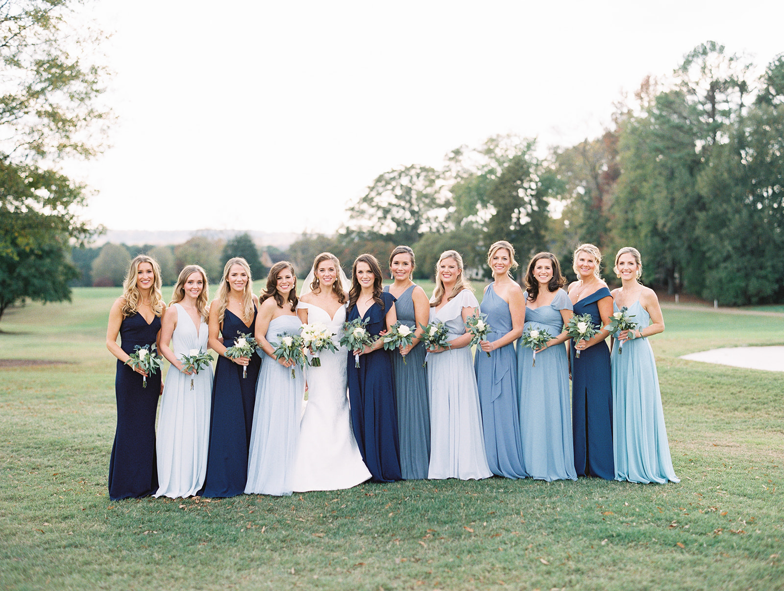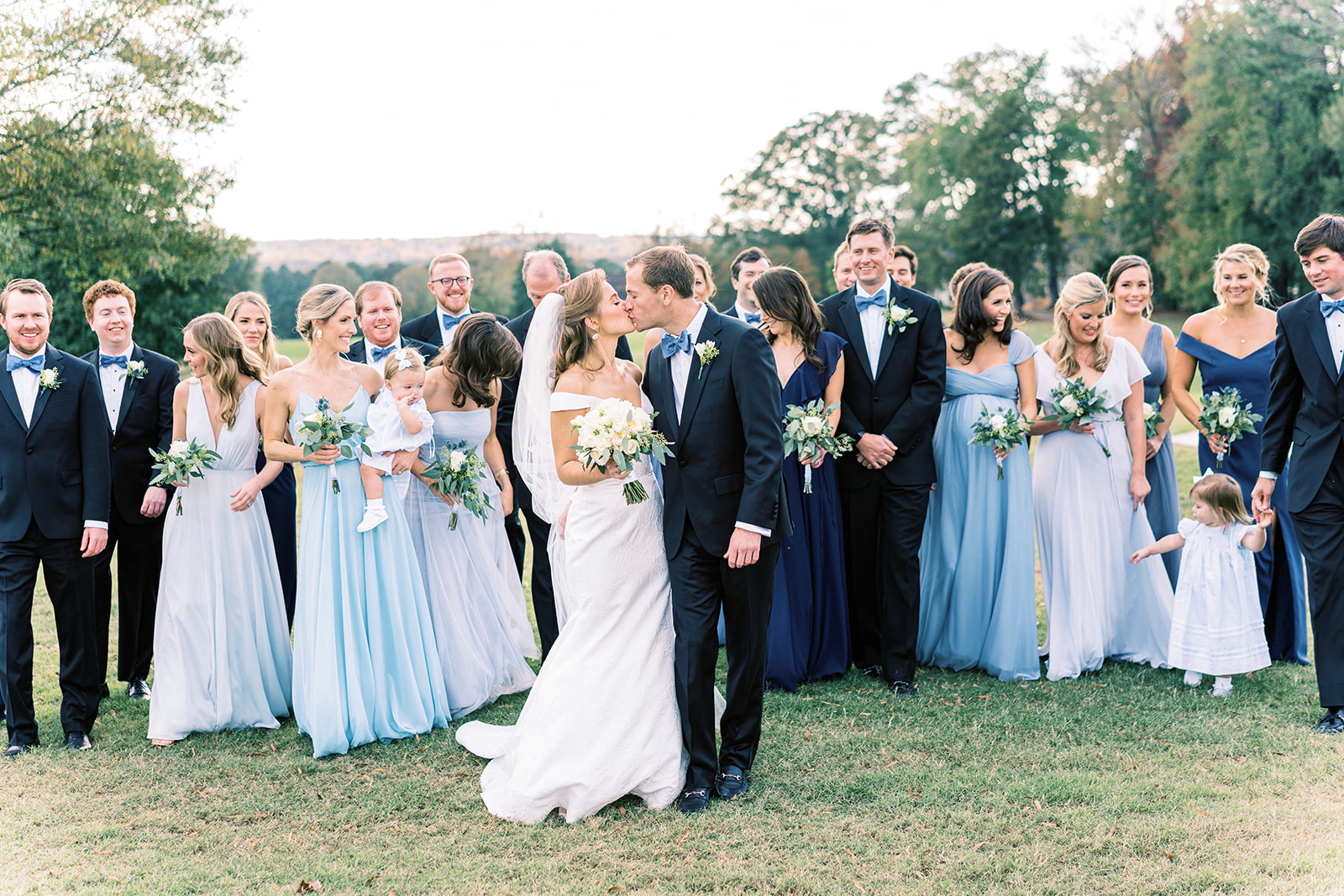 An element we adored of Annie’s big day was her color palette. Which surprise, surprise she was fairly relaxed about! She knew from the get go that blue was her bridesmaids color of choice and narrowed down the vast options to three shades: Navy, Slate, and Ice. Each bridesmaid got to pick their gown style and color, some even pulling from their closet if they already owned a dress that worked. Annie explained her decision by saying, “My bridesmaids are each uniquely beautiful, and I wanted their dresses to be uniquely ‘theirs’ while still looking cohesive together”. Once the bridesmaids gowns were chosen the official color palette decisions came into play… yes, blueberries on the cake was a part of that (not to mention the groom’s favorite fruit).