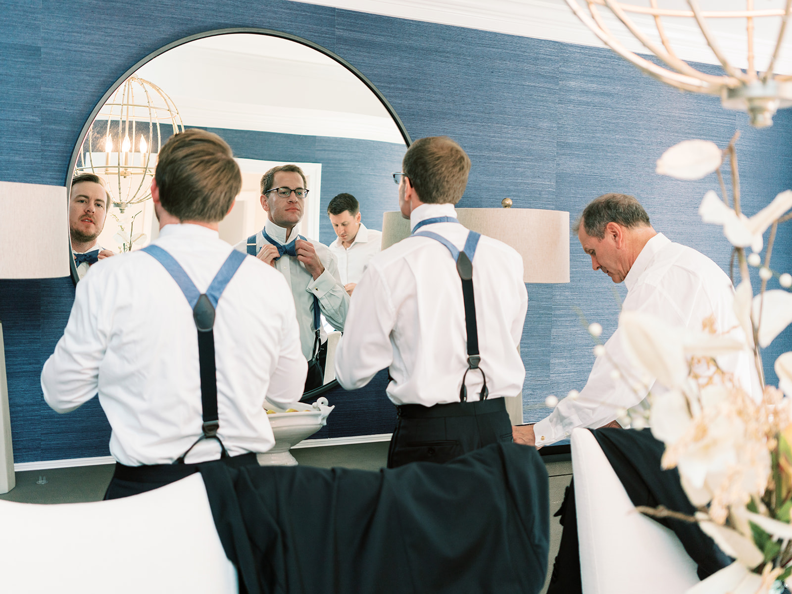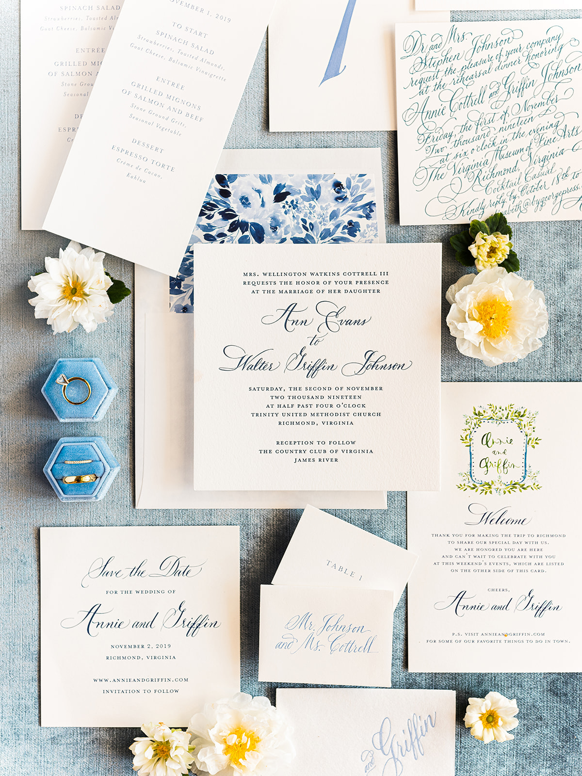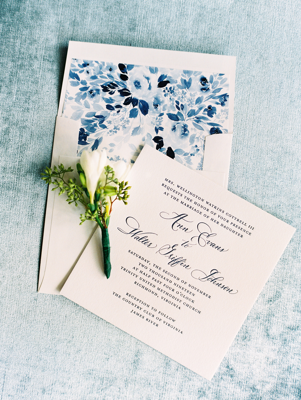 An element we adored of Annie’s big day was her color palette. Which surprise, surprise she was fairly relaxed about! She knew from the get go that blue was her bridesmaids color of choice and narrowed down the vast options to three shades: Navy, Slate, and Ice. Each bridesmaid got to pick their gown style and color, some even pulling from their closet if they already owned a dress that worked. Annie explained her decision by saying, “My bridesmaids are each uniquely beautiful, and I wanted their dresses to be uniquely ‘theirs’ while still looking cohesive together”. Once the bridesmaids gowns were chosen the official color palette decisions came into play… yes, blueberries on the cake was a part of that (not to mention the groom’s favorite fruit).