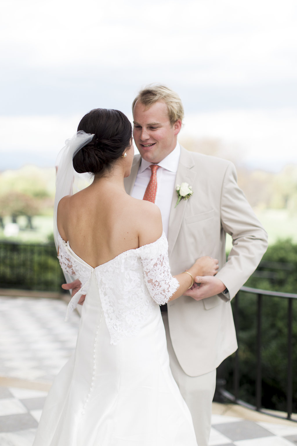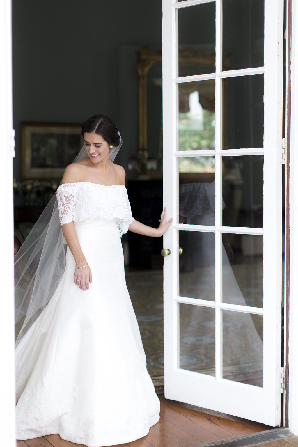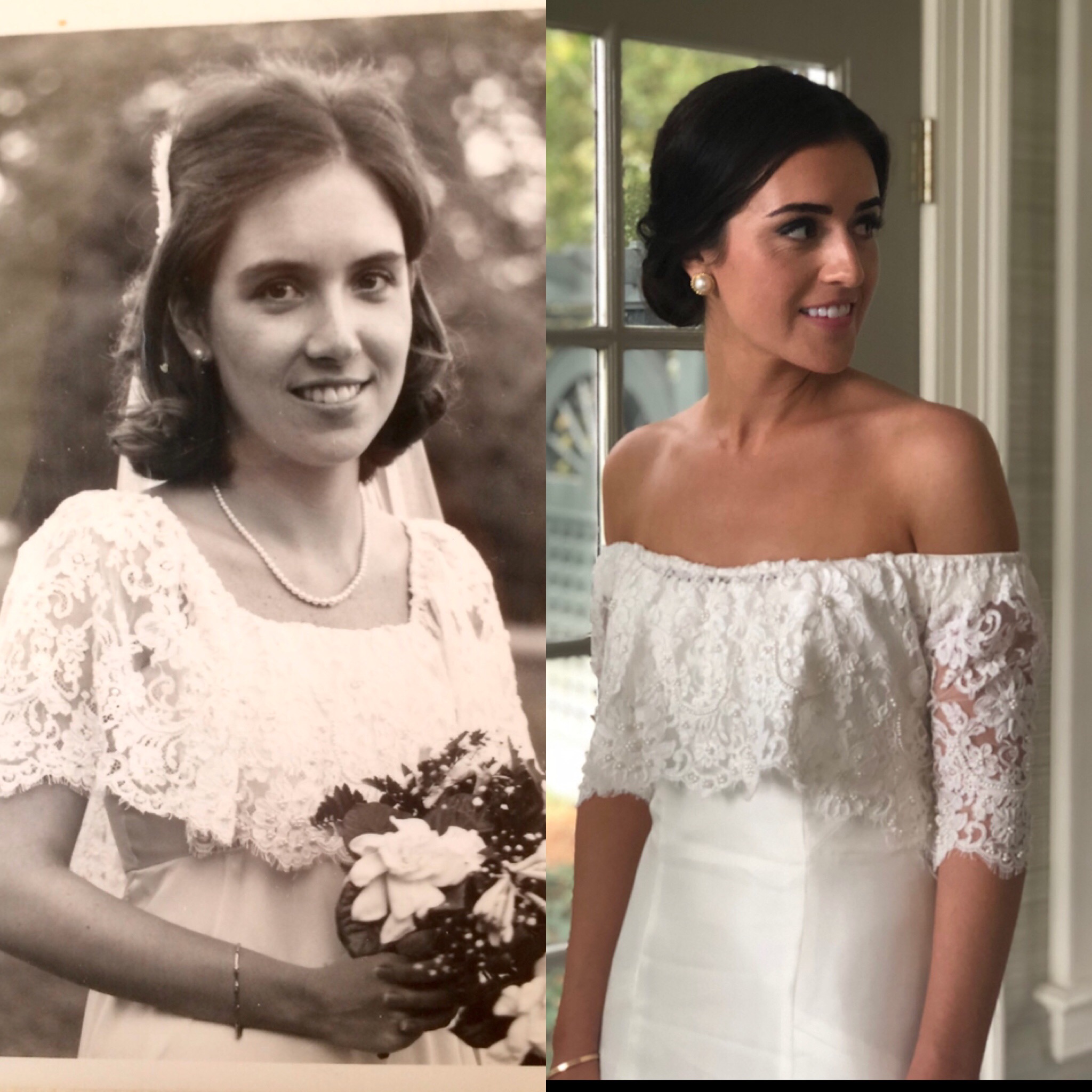 Before changing into that gorgeous jumpsuit, Claire did spend hours in her gown. Perhaps our favorite part of her bridal look was a topper she had custom made for the dress. The lace for this special topper came from her mother’s wedding dress. “I knew going into dress shopping that I wanted to incorporate my mom’s wedding dress in some way as my ‘something old’ Claire proudly stated. “I was so thankful to have a part of her with me on my big day as she passed away when I was little. I’m forever grateful to Claudia for her help in making this happen and to Lindsey for her encouragement and ideas along the way.” In the gallery below you’ll find stunning shots of how her bridal look came together & a side-by-side snapshot taken of Claire’s mom in her wedding dress & how Claire channeled her mother’s bridal style for her wedding day!