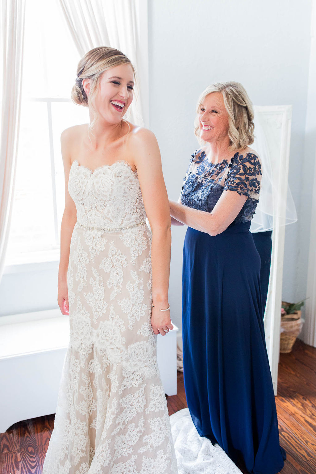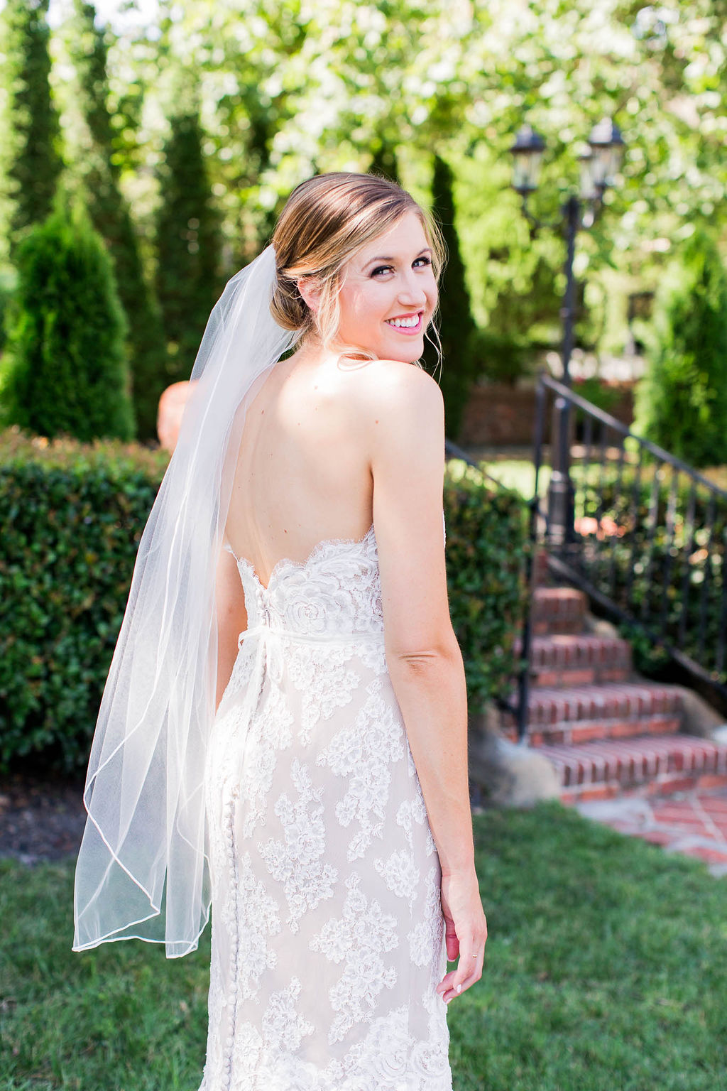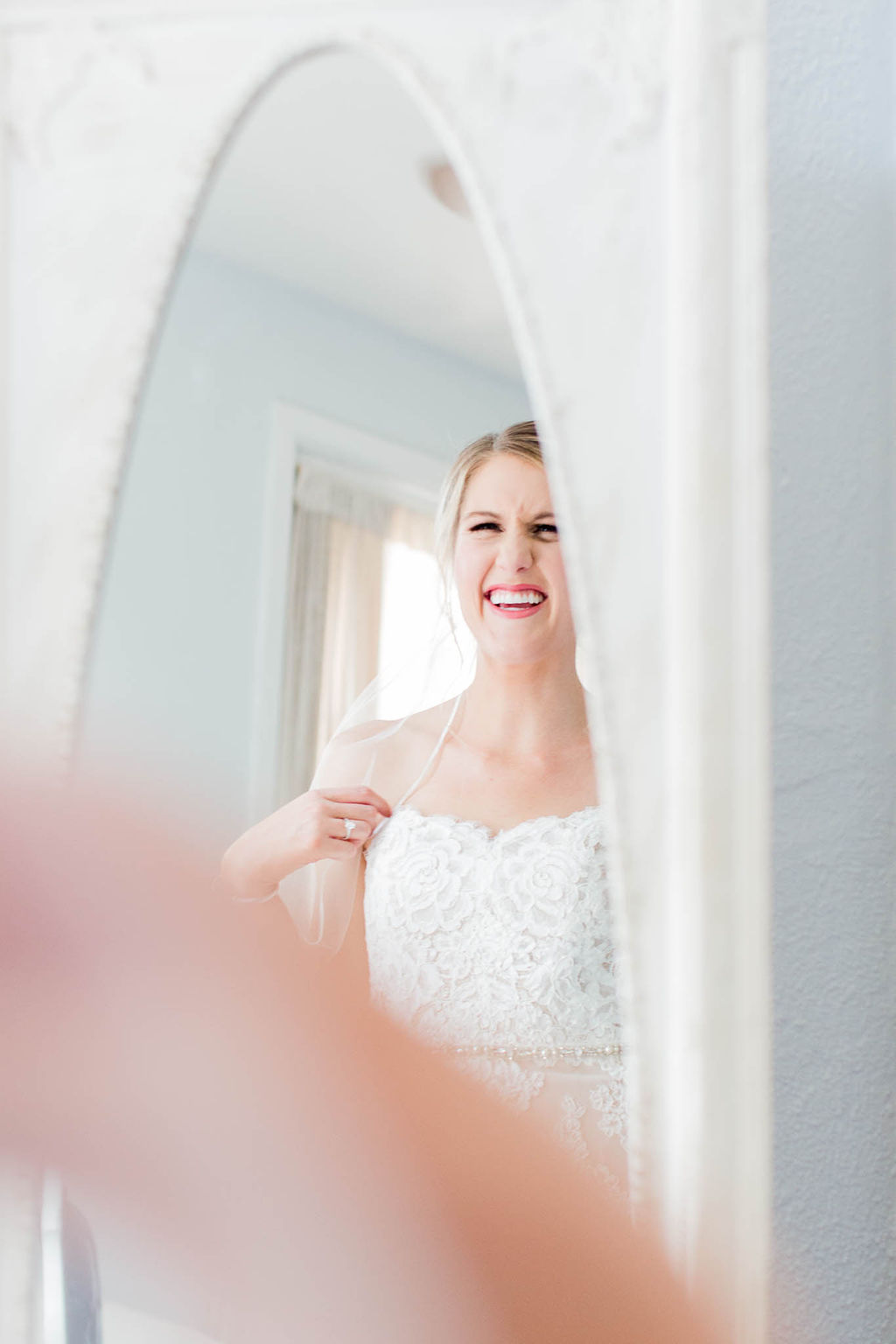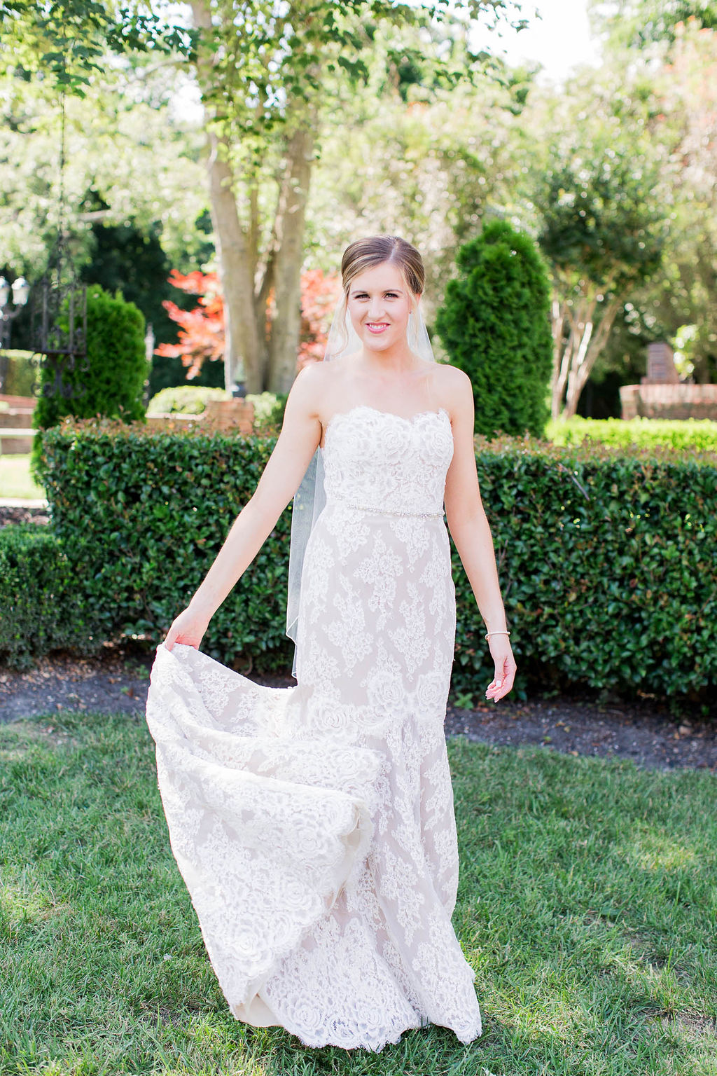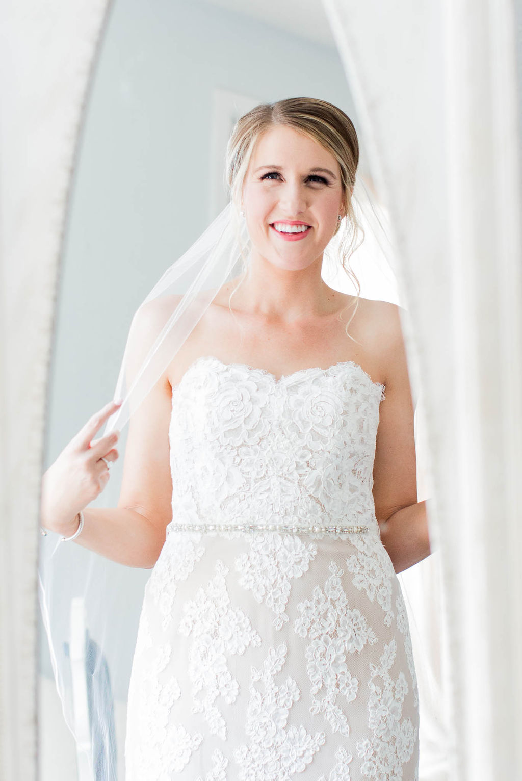 Katie recalls, “Ironically, the dress had been in the store since we opened, and it was probably one of the select few that I had never slipped on. When I stepped out to show my family and friends, I fell in love with all of the details that I had somehow overlooked: the scalloped lace, the contrasting colors and the fit. Once Emily slipped on my favorite sparkle belt and veil, I had that bridal moment everyone always talks about and knew it was the dress that I had to wear down the aisle”.