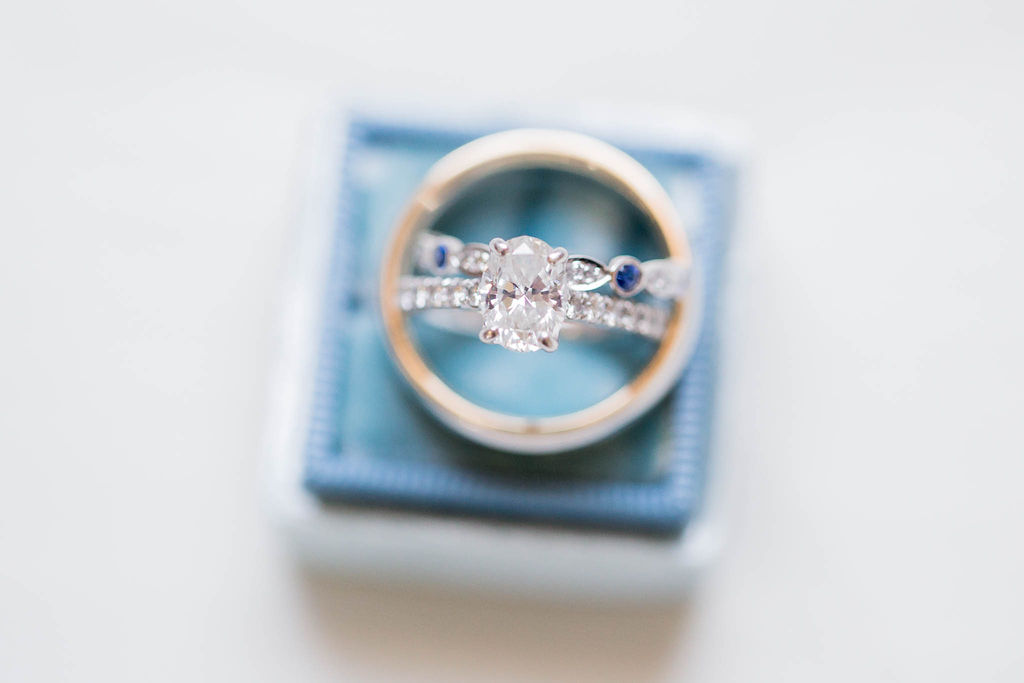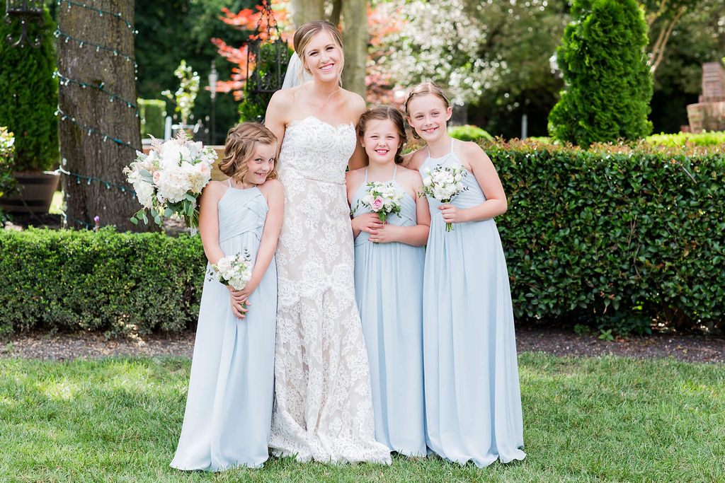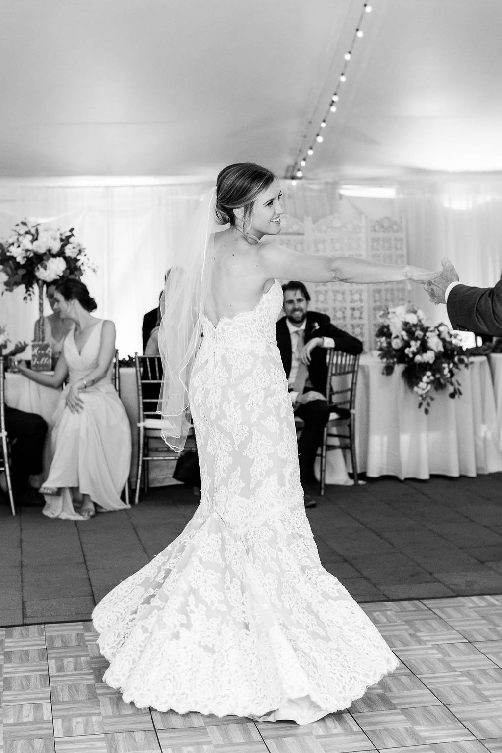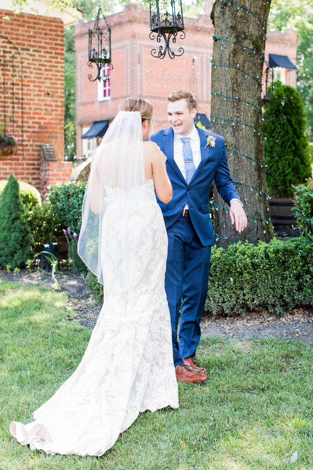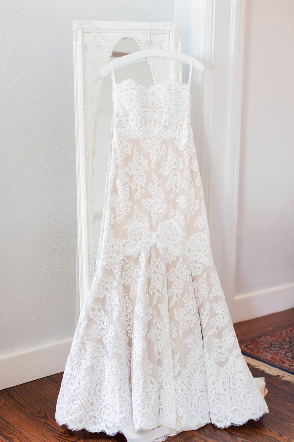 Katie recalls, “Ironically, the dress had been in the store since we opened, and it was probably one of the select few that I had never slipped on. When I stepped out to show my family and friends, I fell in love with all of the details that I had somehow overlooked: the scalloped lace, the contrasting colors and the fit. Once Emily slipped on my favorite sparkle belt and veil, I had that bridal moment everyone always talks about and knew it was the dress that I had to wear down the aisle”.