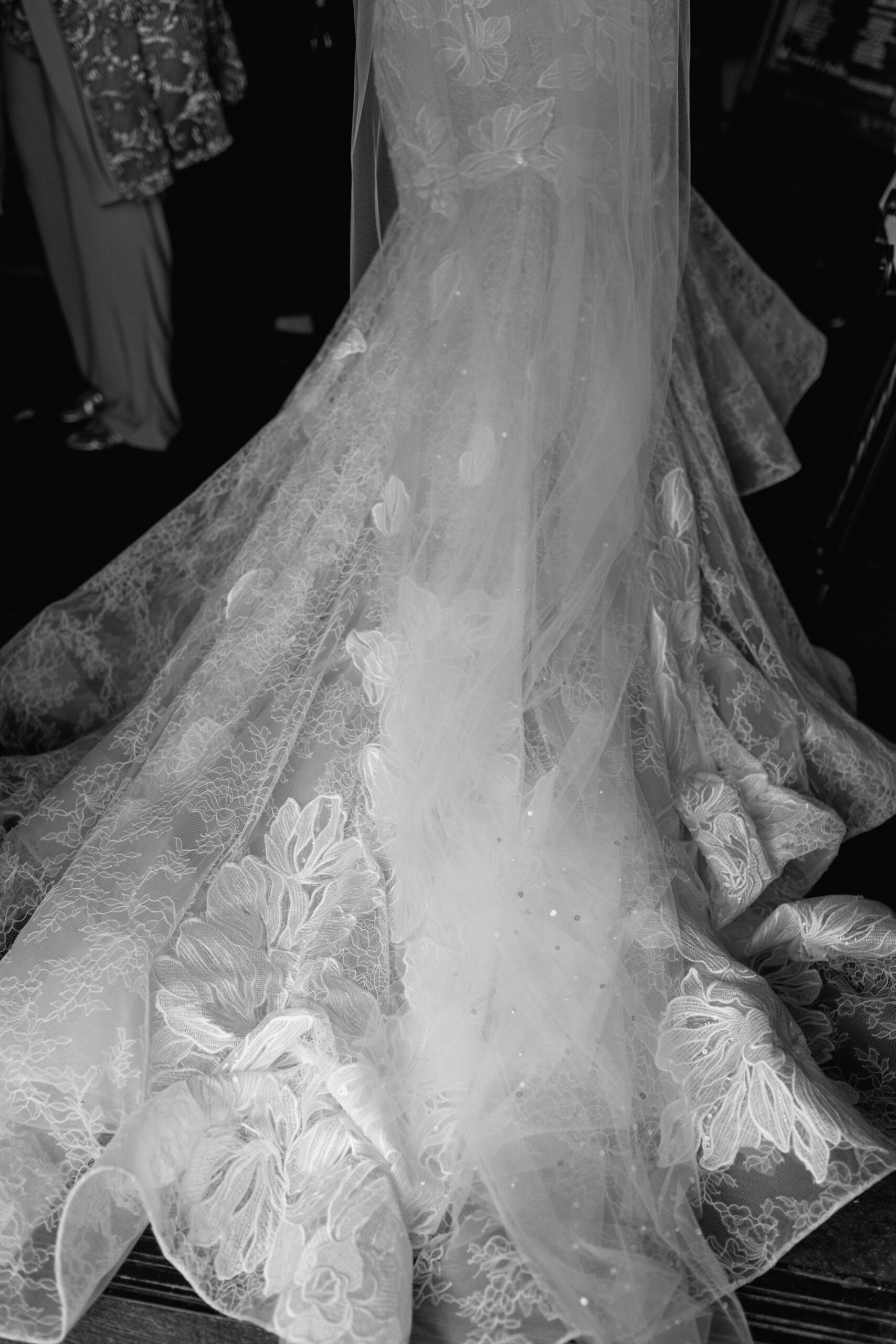 She went with a long veil with minimal beading and added a blusher for a little extra volume and drama. “A plain veil just would not have done the dress or my style justice.”