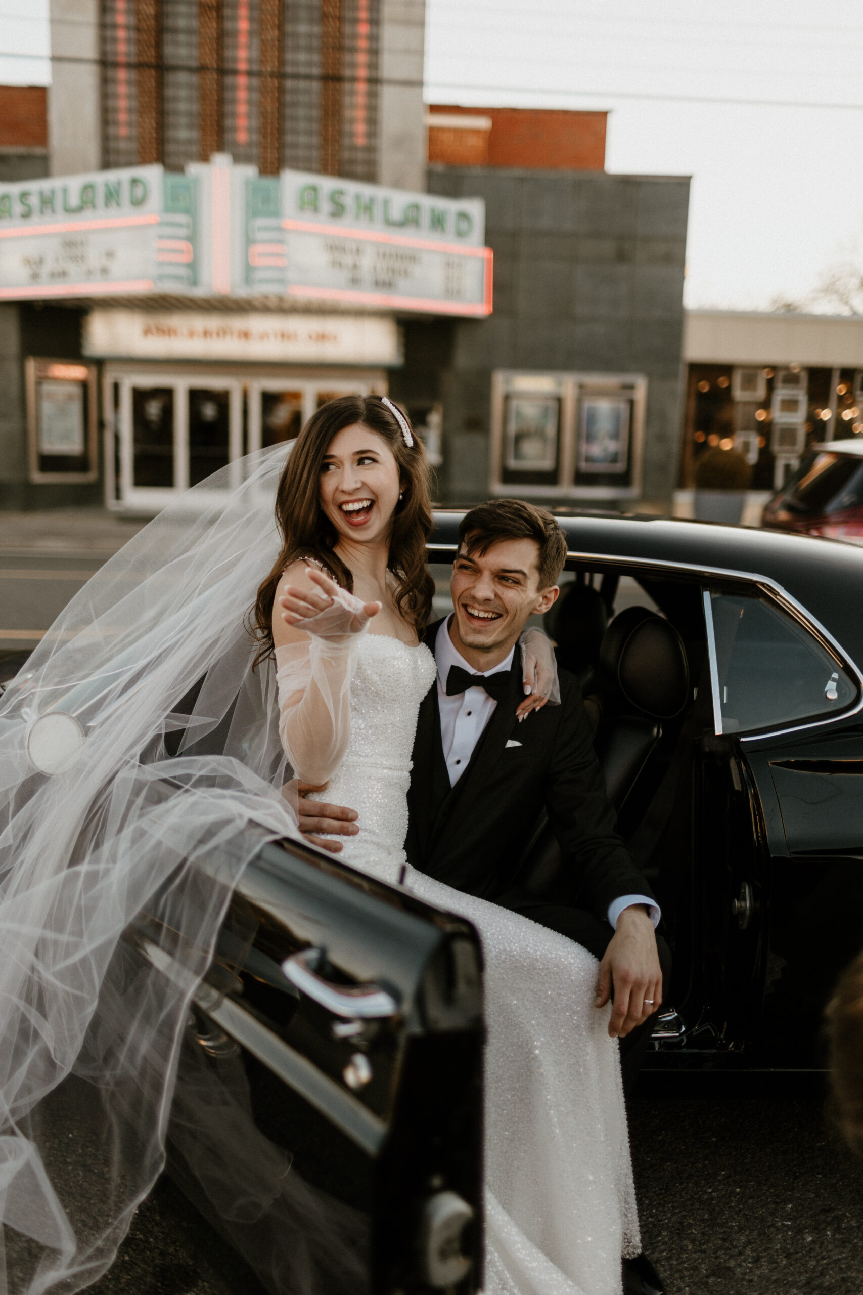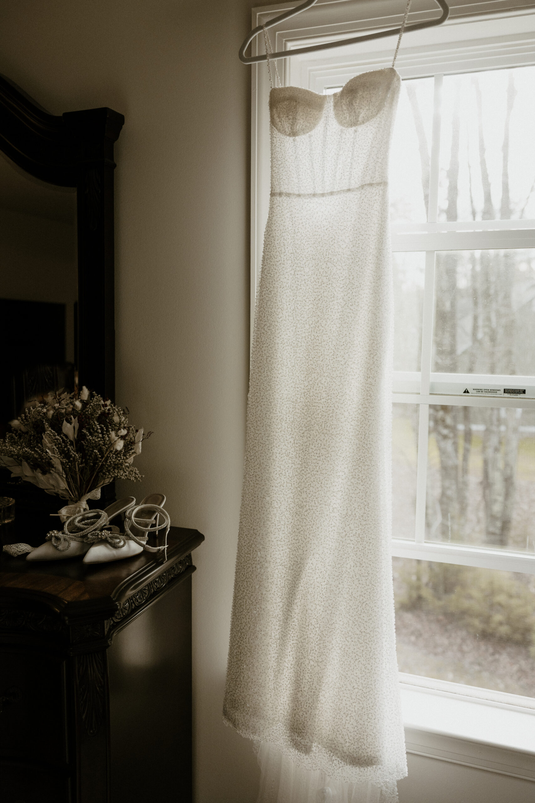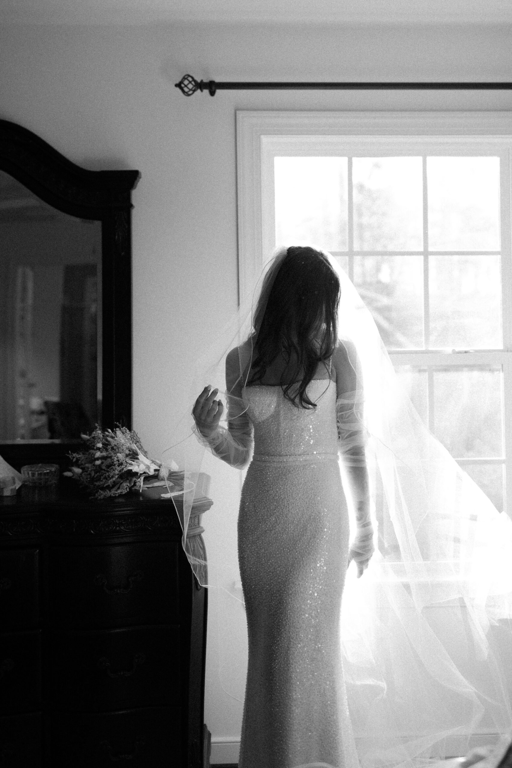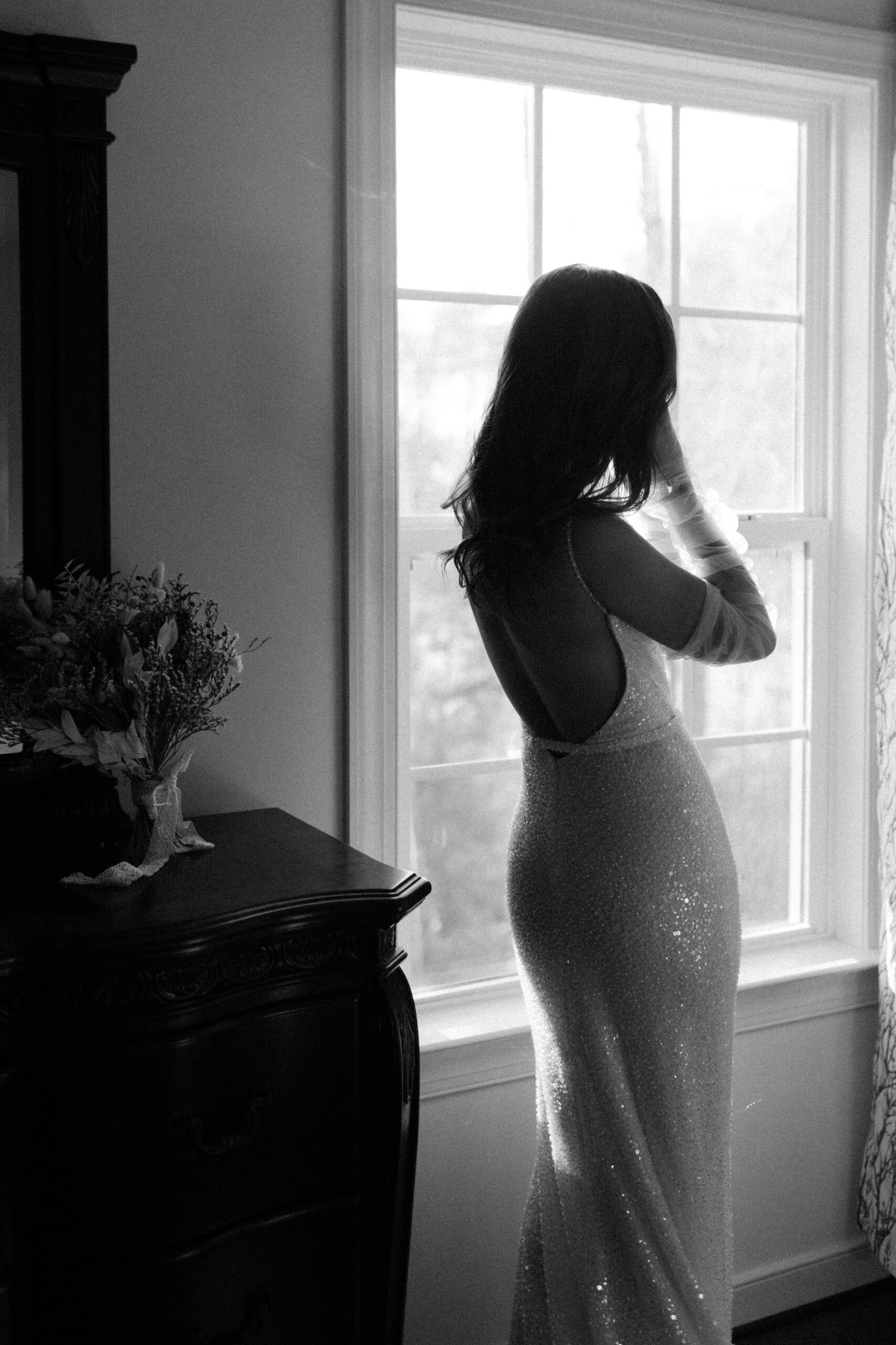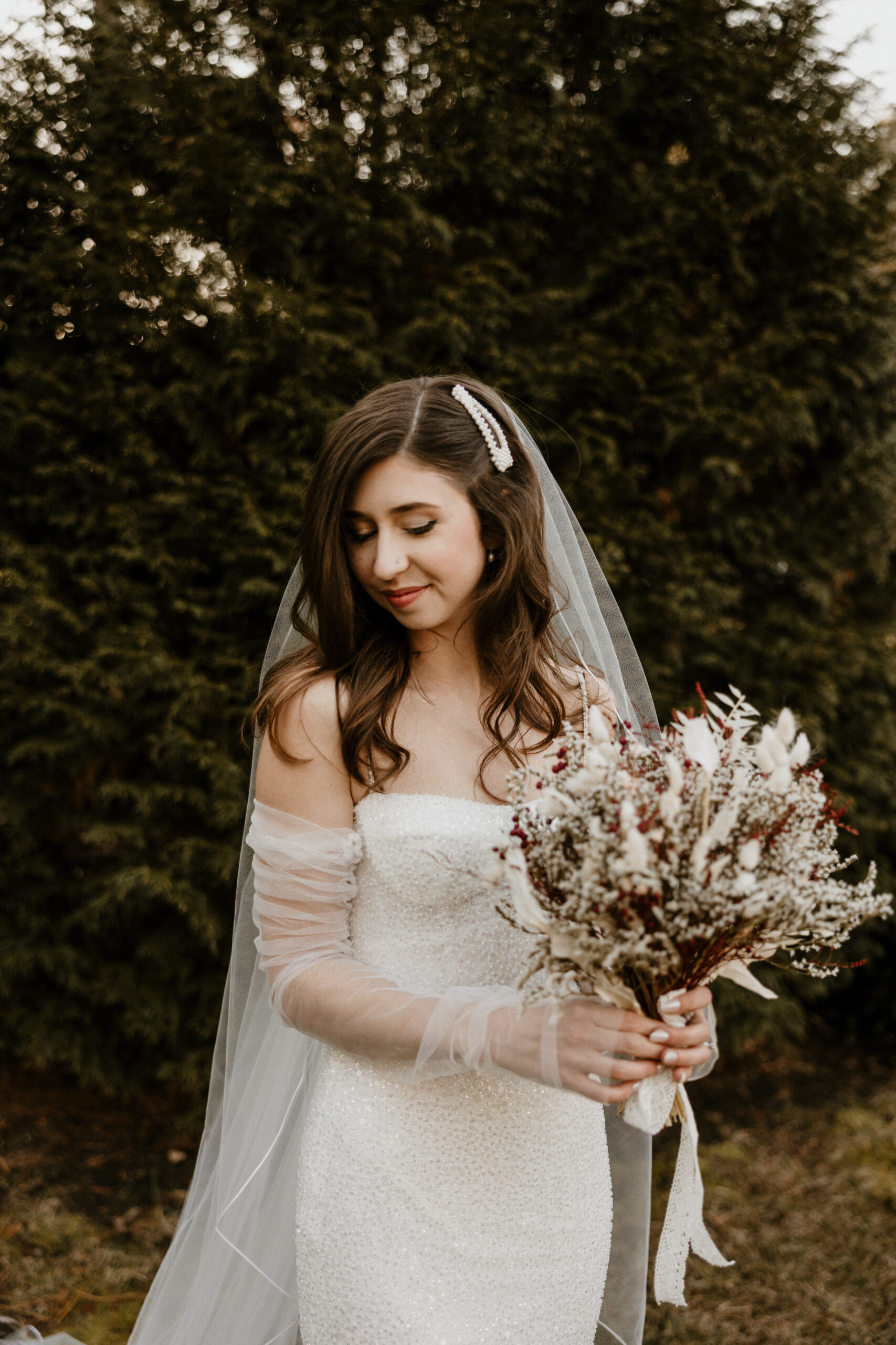 ‘Lola’ by Made With Love took her breath away. She loves the way it shaped her body perfectly and almost “sparkled like the snow”. So Alexis traded in her dream of sleeves for the Made With Love tulle gloves.