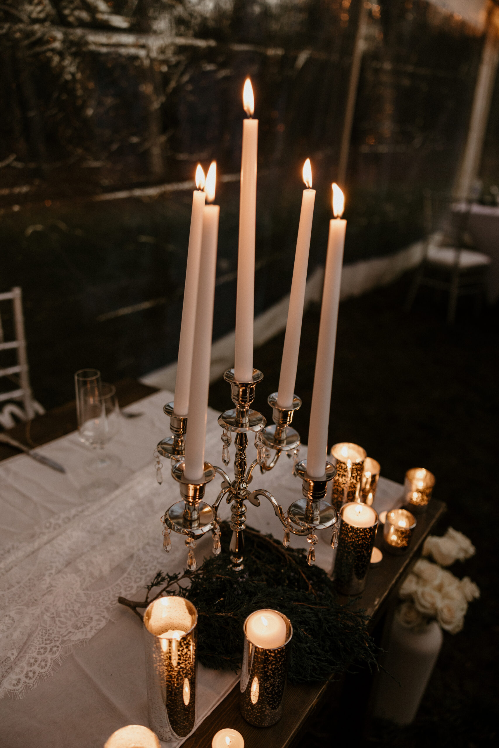 The decor was beautiful and classic. Some elements included embellished twinkle lights, white roses, and milk glass candle holders with tall white candles.