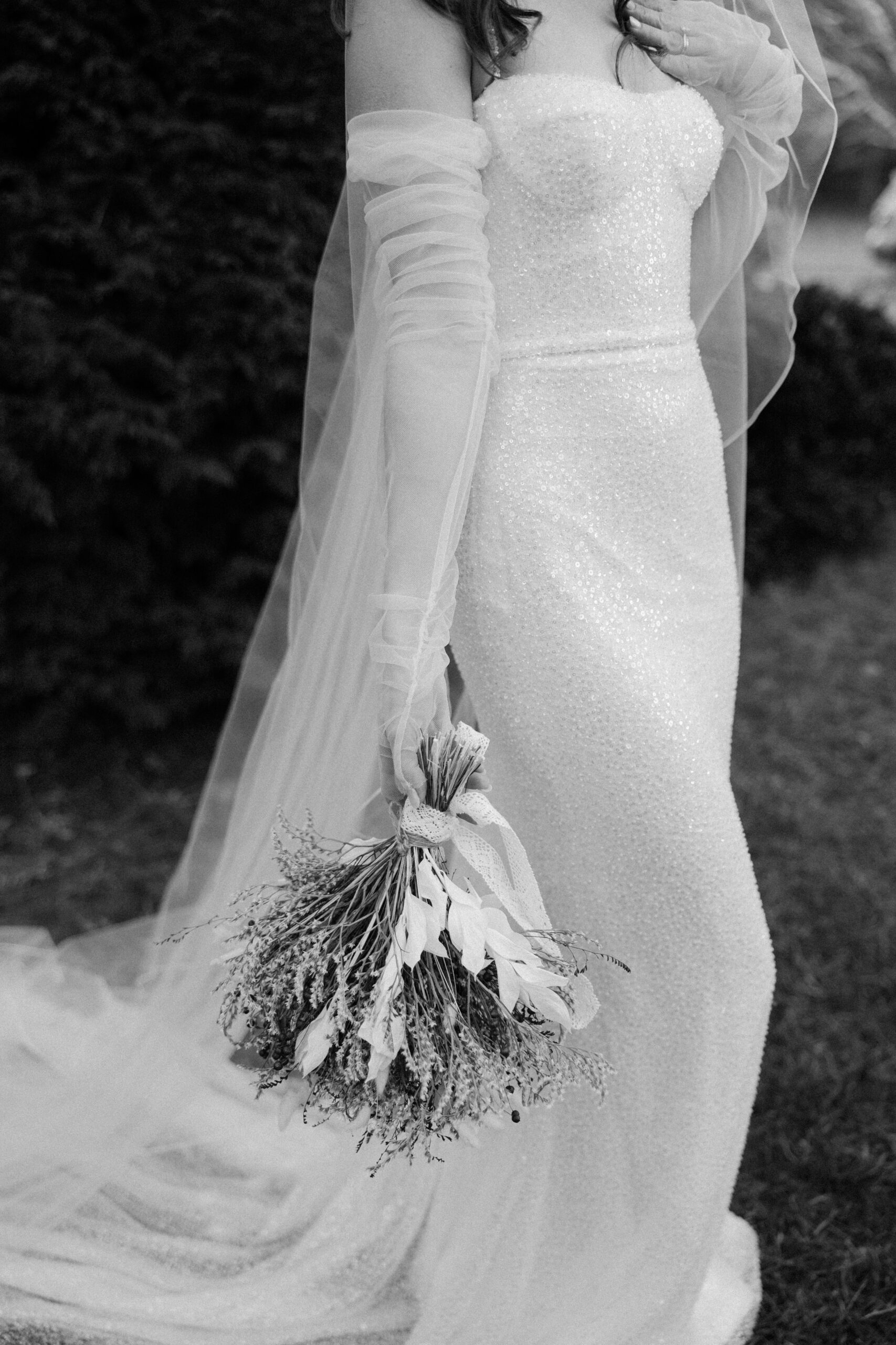 ‘Lola’ by Made With Love took her breath away. She loves the way it shaped her body perfectly and almost “sparkled like the snow”. So Alexis traded in her dream of sleeves for the Made With Love tulle gloves.