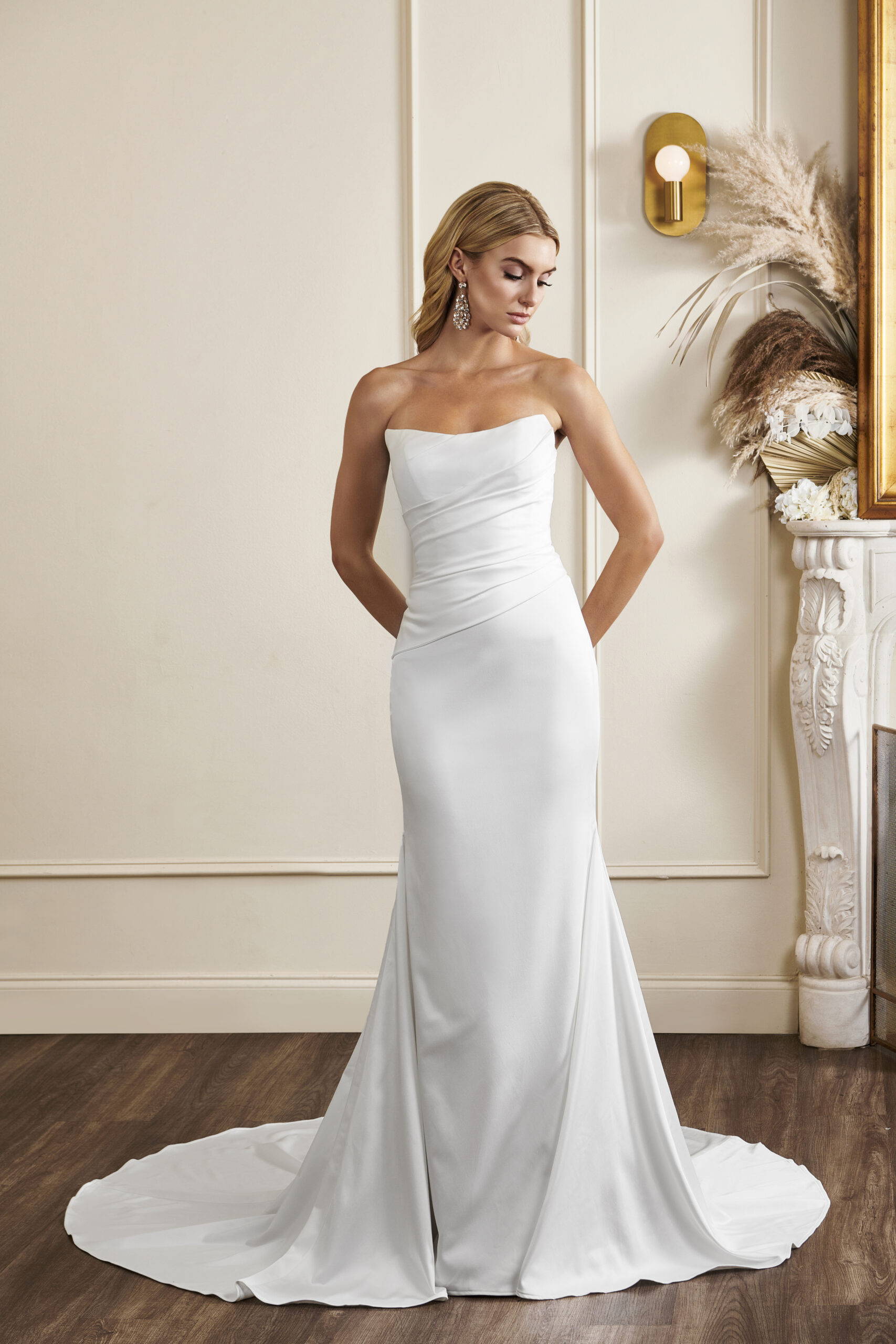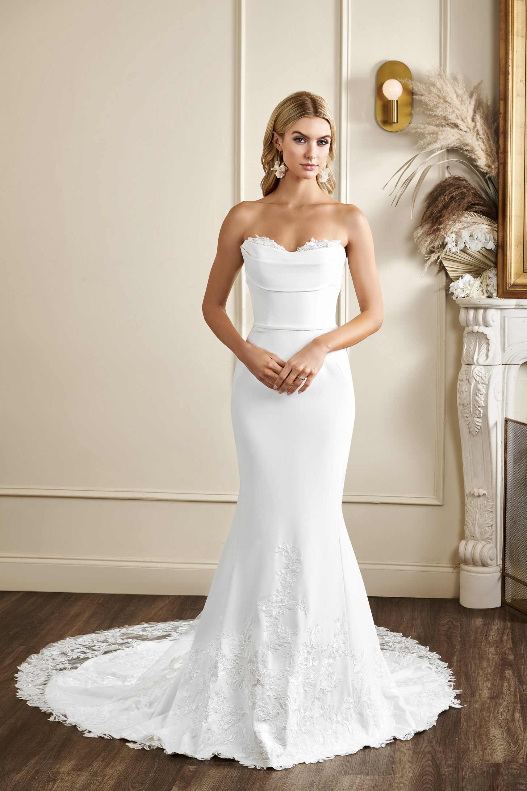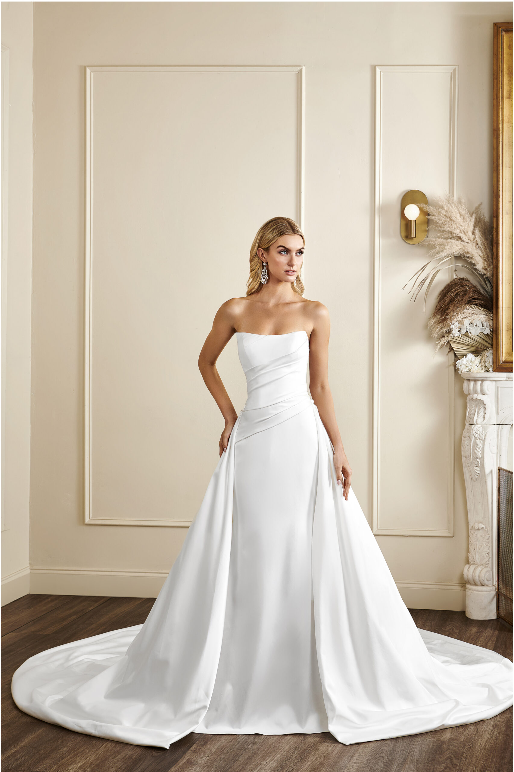 This draped strapless wedding dress is made of crepe and lace.