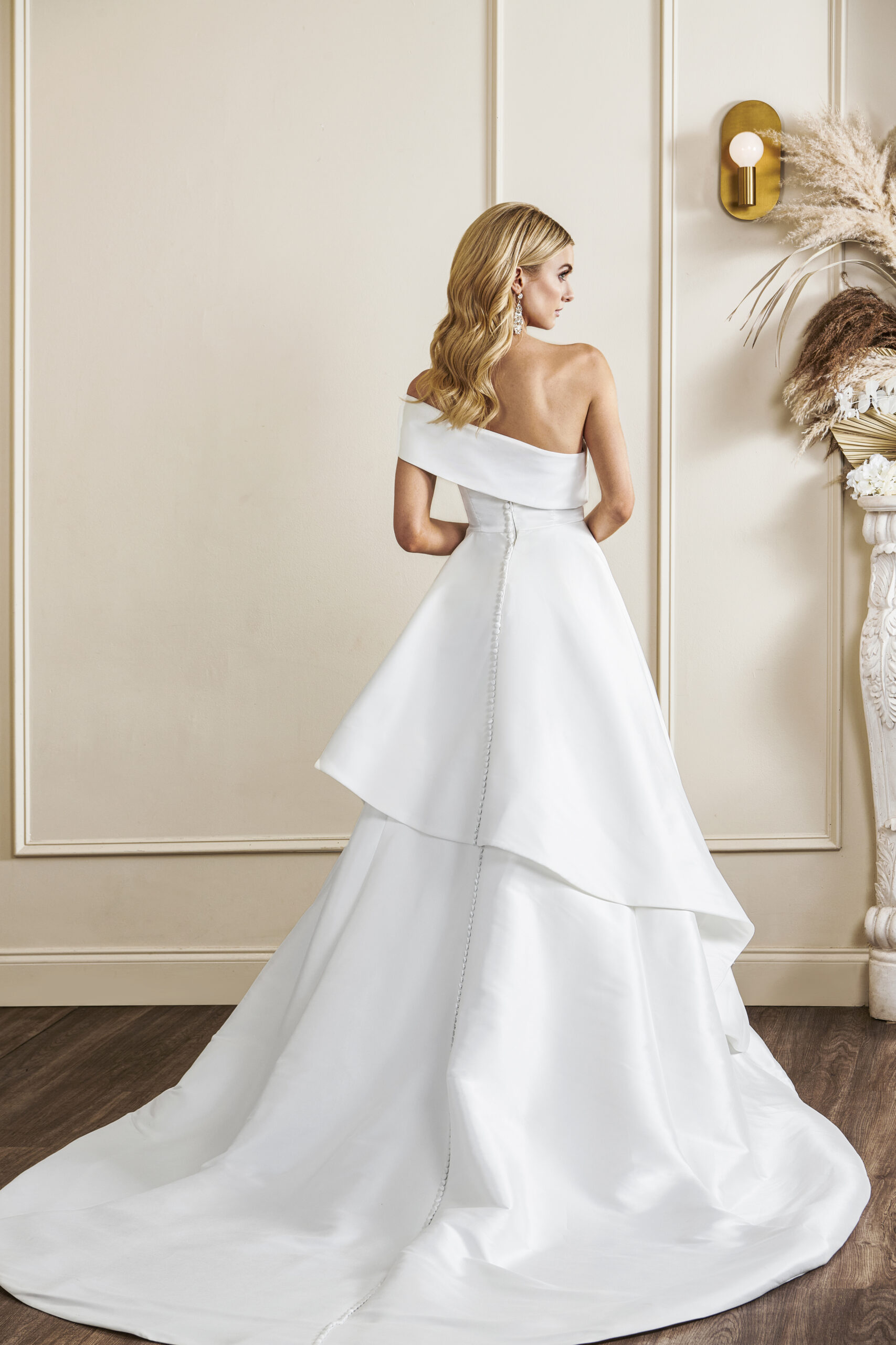 An asymmetrical statement bow adds detail to the back. Equally captivating, is the full circle train, adorned with covered buttons.