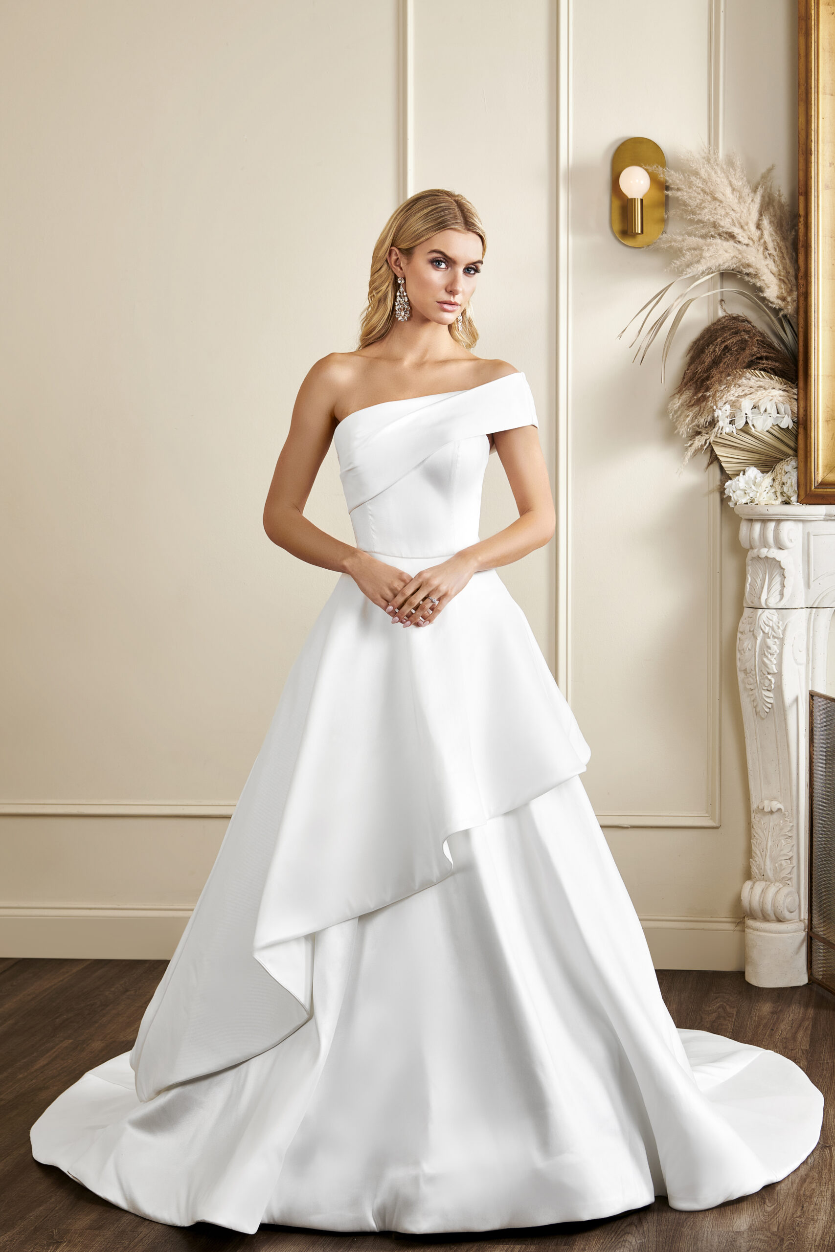 Though not currently available in shop, Crosby can be ordered with ‘Crosby Bolero’. This one-shoulder bridal bolero offers support, with its thick strap and draped bodice.