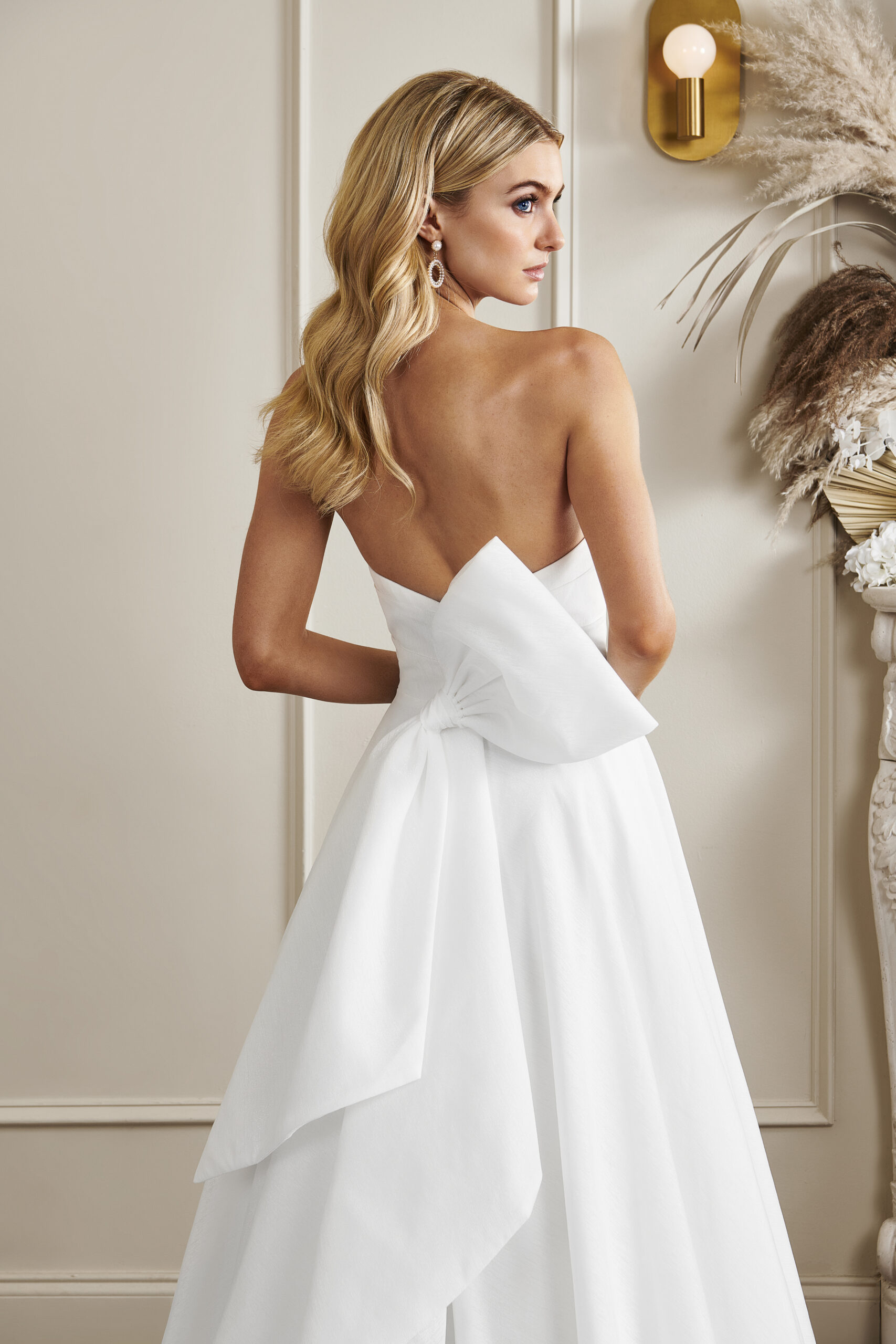 The open back is finished with detachable bow and box pleat ballgown skirt.