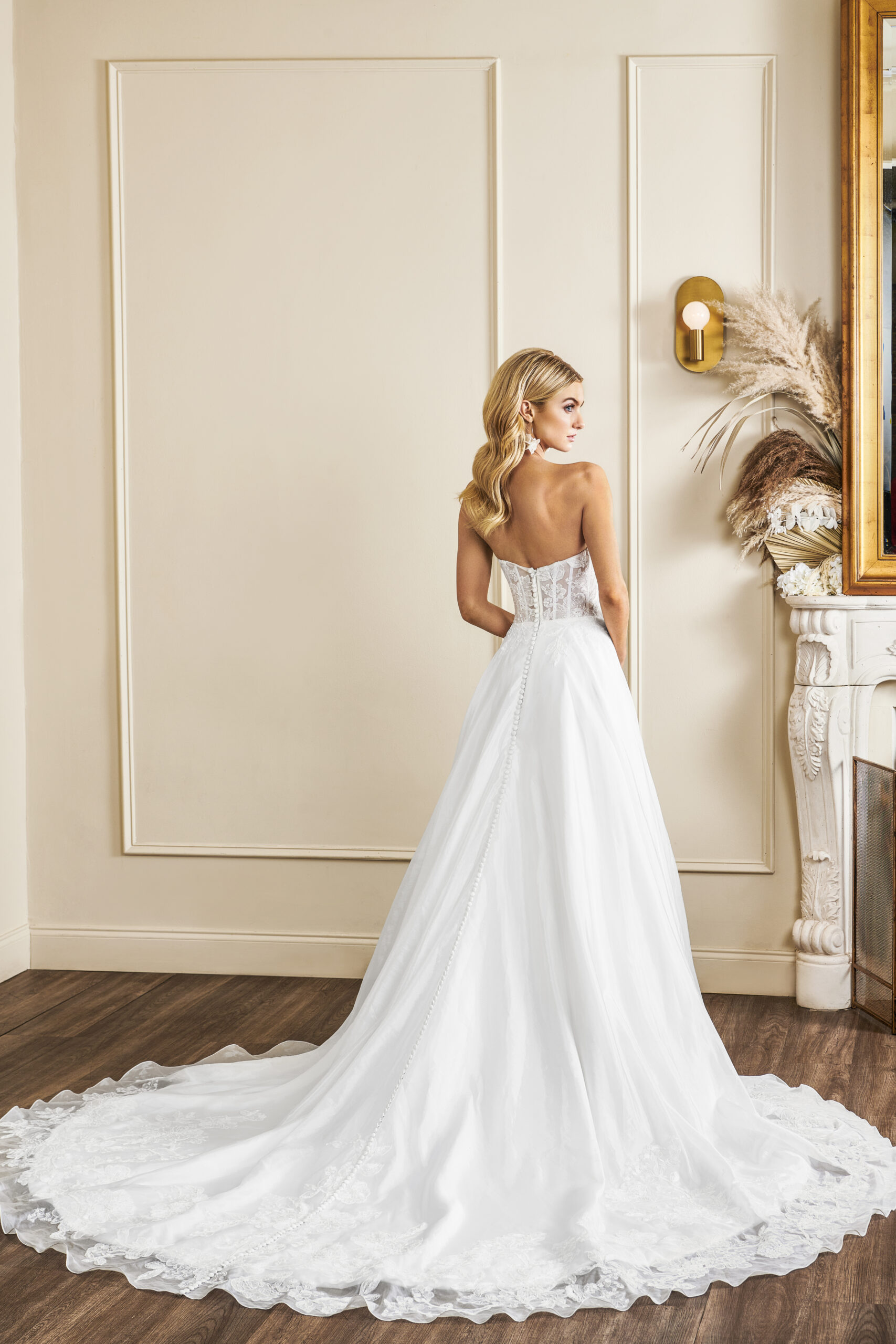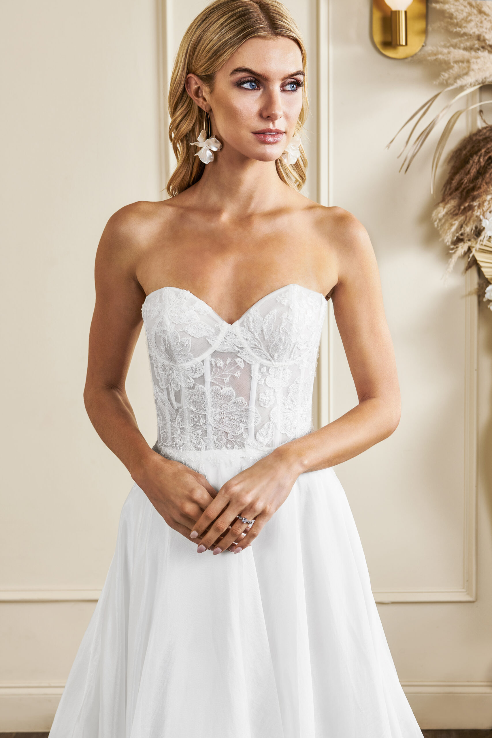Madison dress by Kelly Faetanini has a strapless lace corset bodice. Add long lace sleeves by wearing ‘Madison Bolero’ over Madison dress.