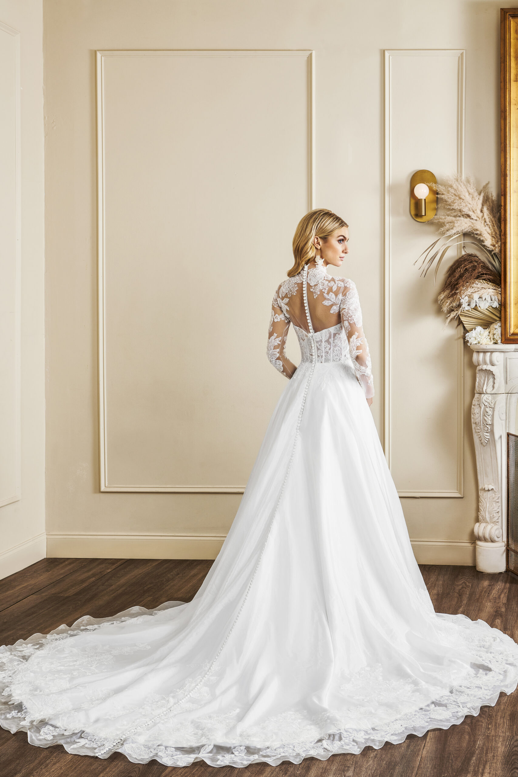 A mock neck lace wedding dress fit for a winter wedding or spring nuptials.