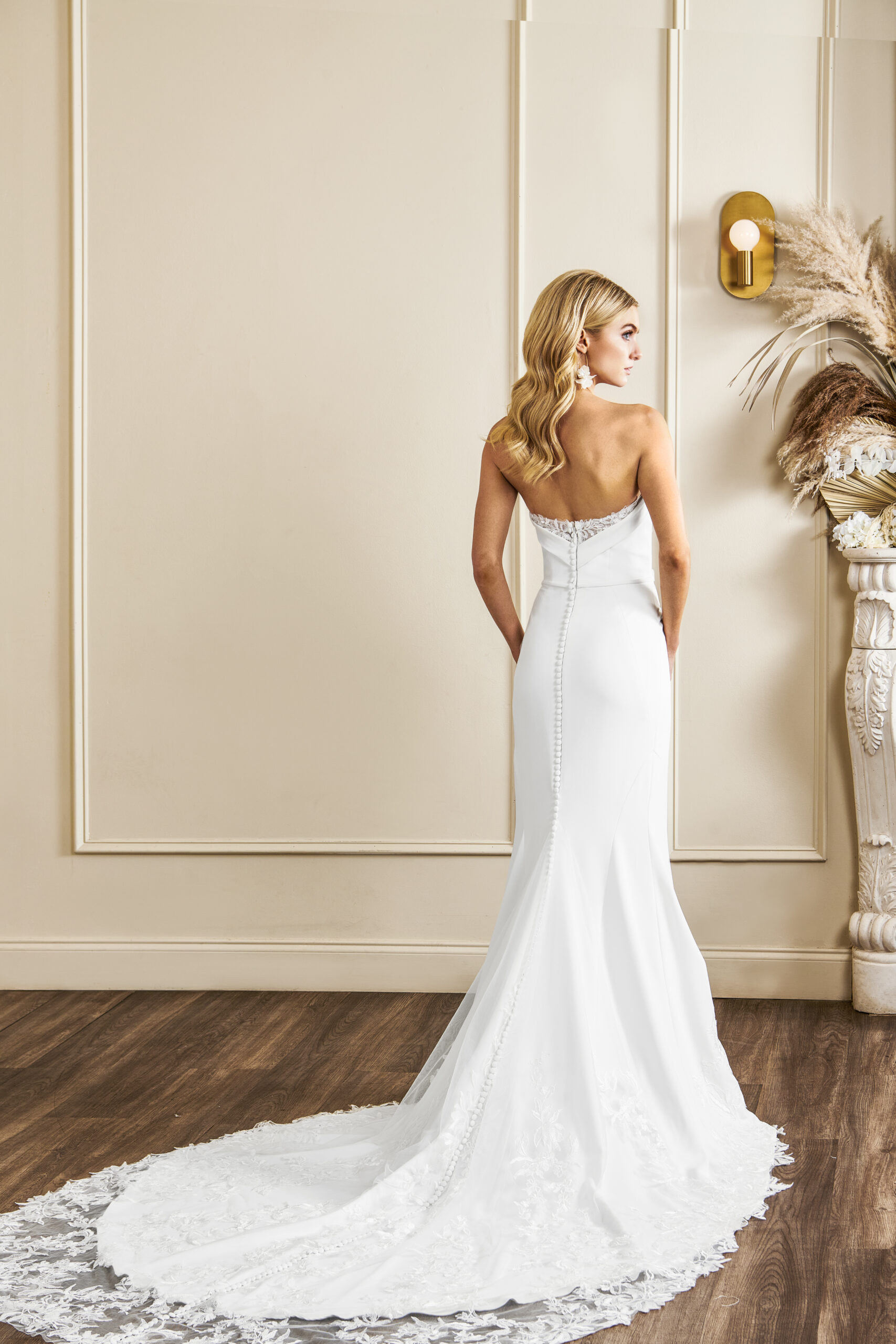 Madison dress by Kelly Faetanini has a strapless lace corset bodice. Add long lace sleeves by wearing ‘Madison Bolero’ over Madison dress.