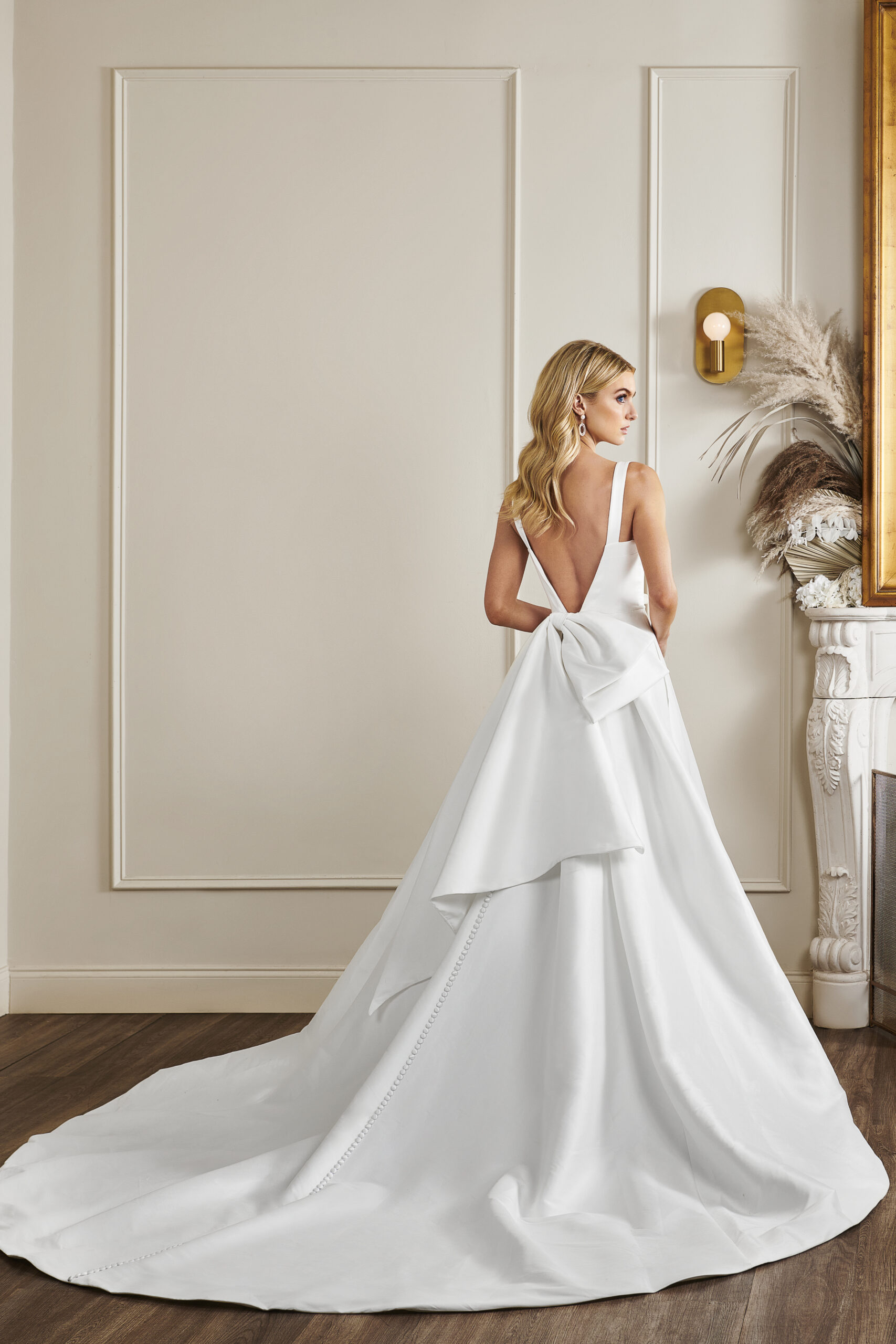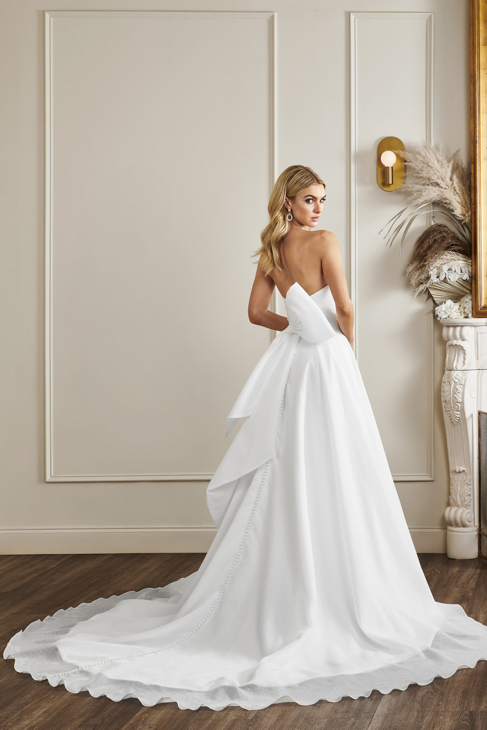 The open back is finished with detachable bow and box pleat ballgown skirt.