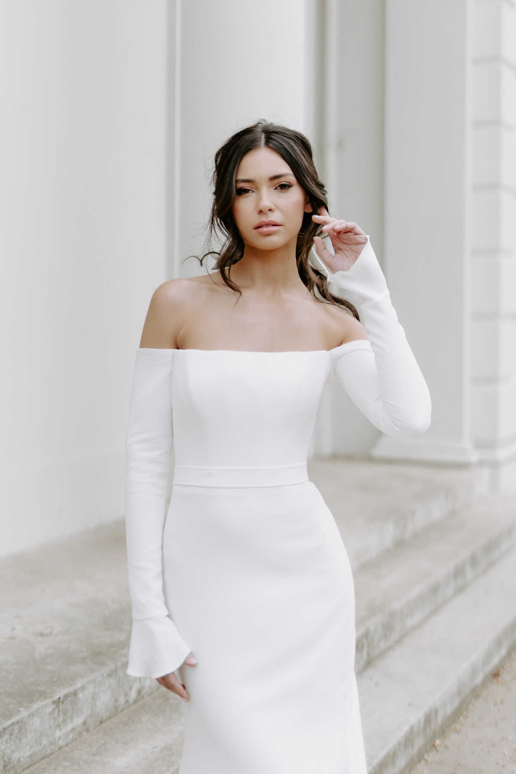 ‘Abigail’ by Suzanne Neville is a sleek simple long sleeve wedding dress that delicately demands attention. With a straight across neckline and long off-the-shoulder fitted crepe sleeves, Abigail’s simplistic allure is soft and elegant.