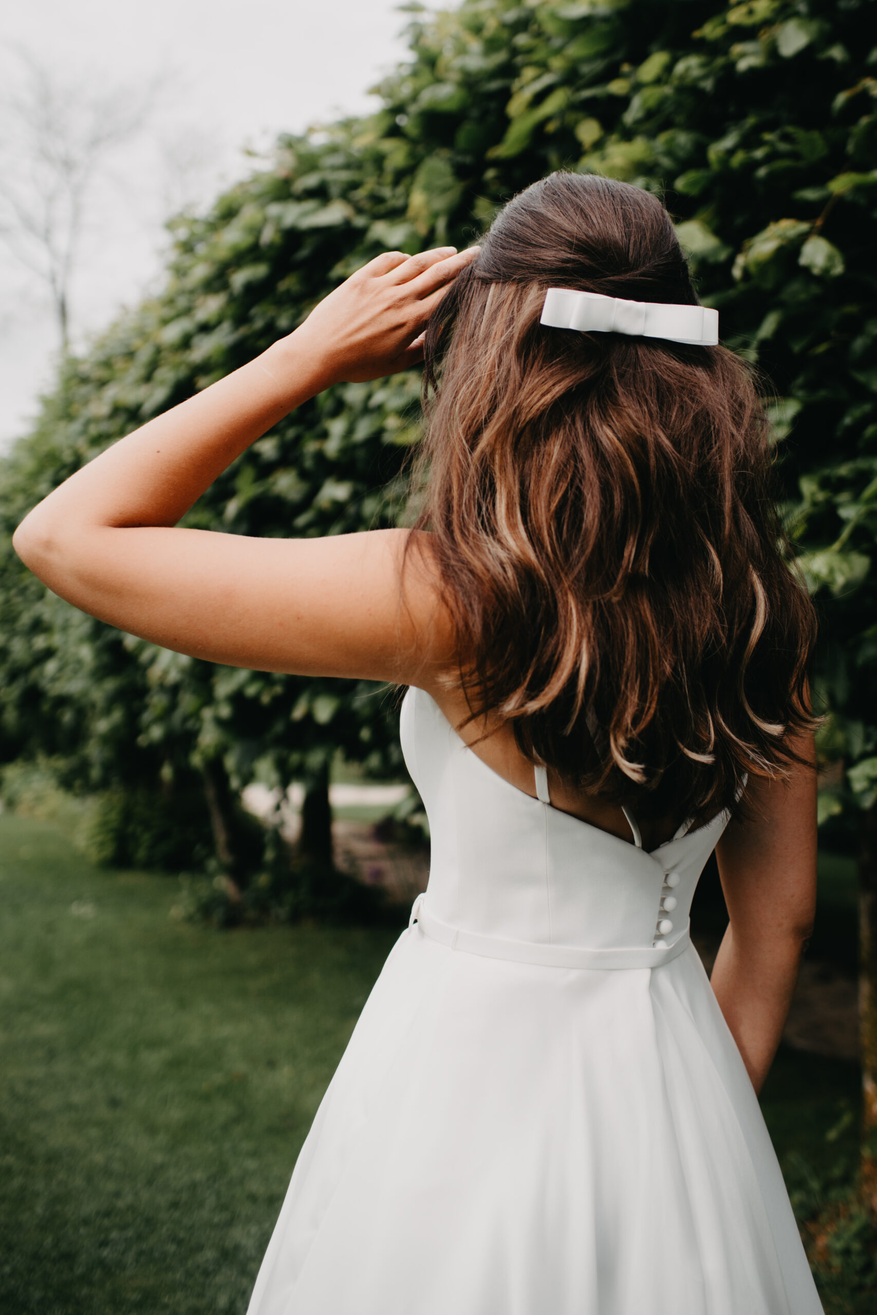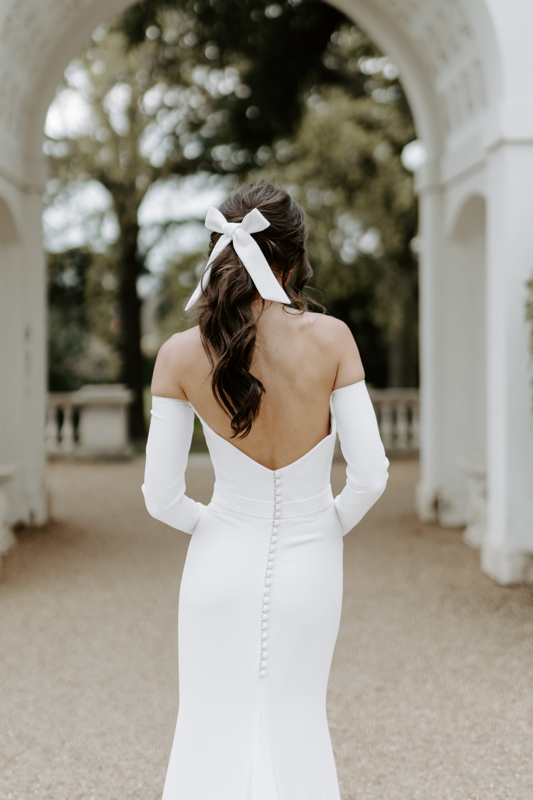 This crepe sheath wedding dress with lace is accented by a thick ribbon at the waist and delicate covered buttons trailing down to the godet. With a long curved crepe train, Delphine could be worn anywhere from a manor wedding or an elegant beach elopement.