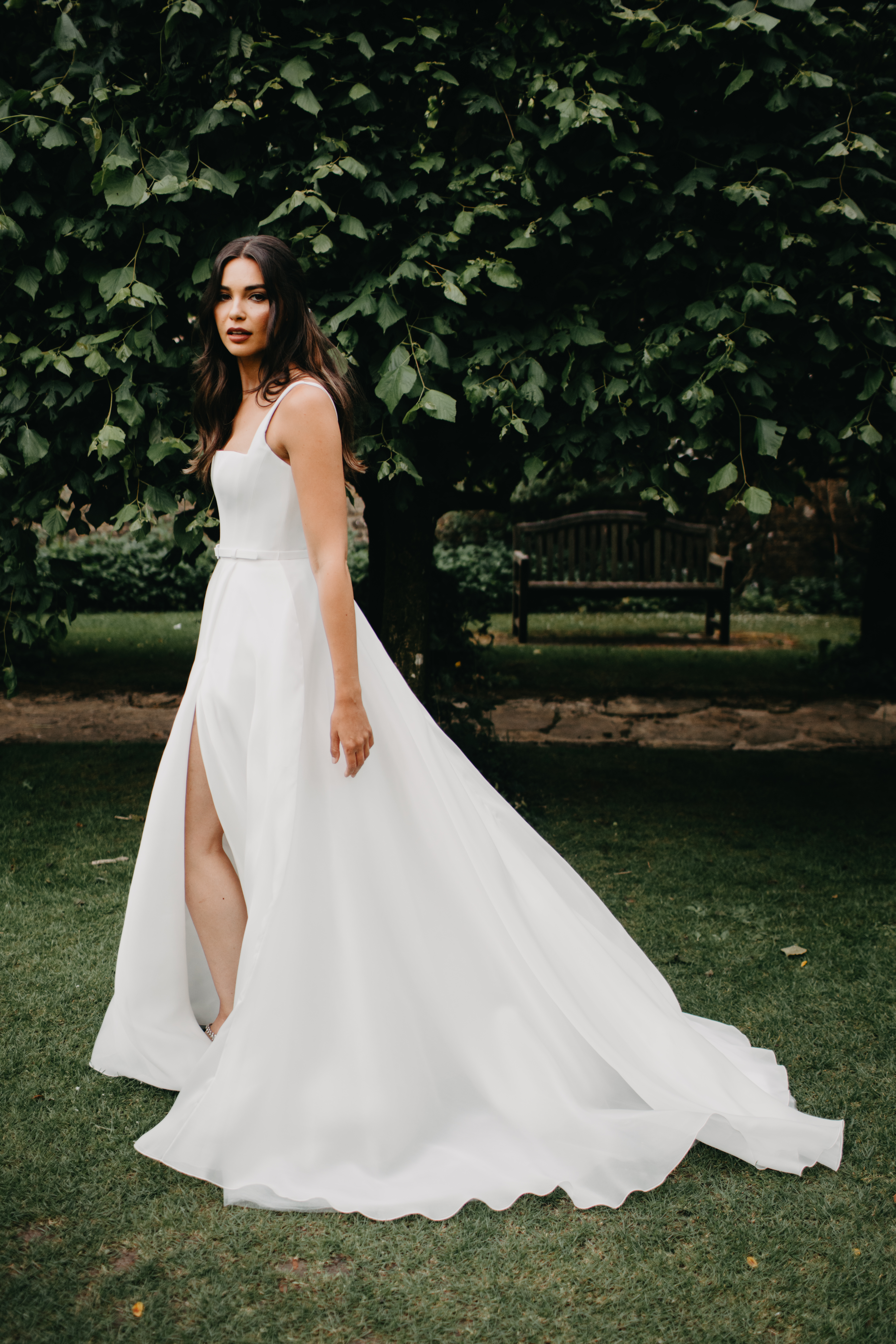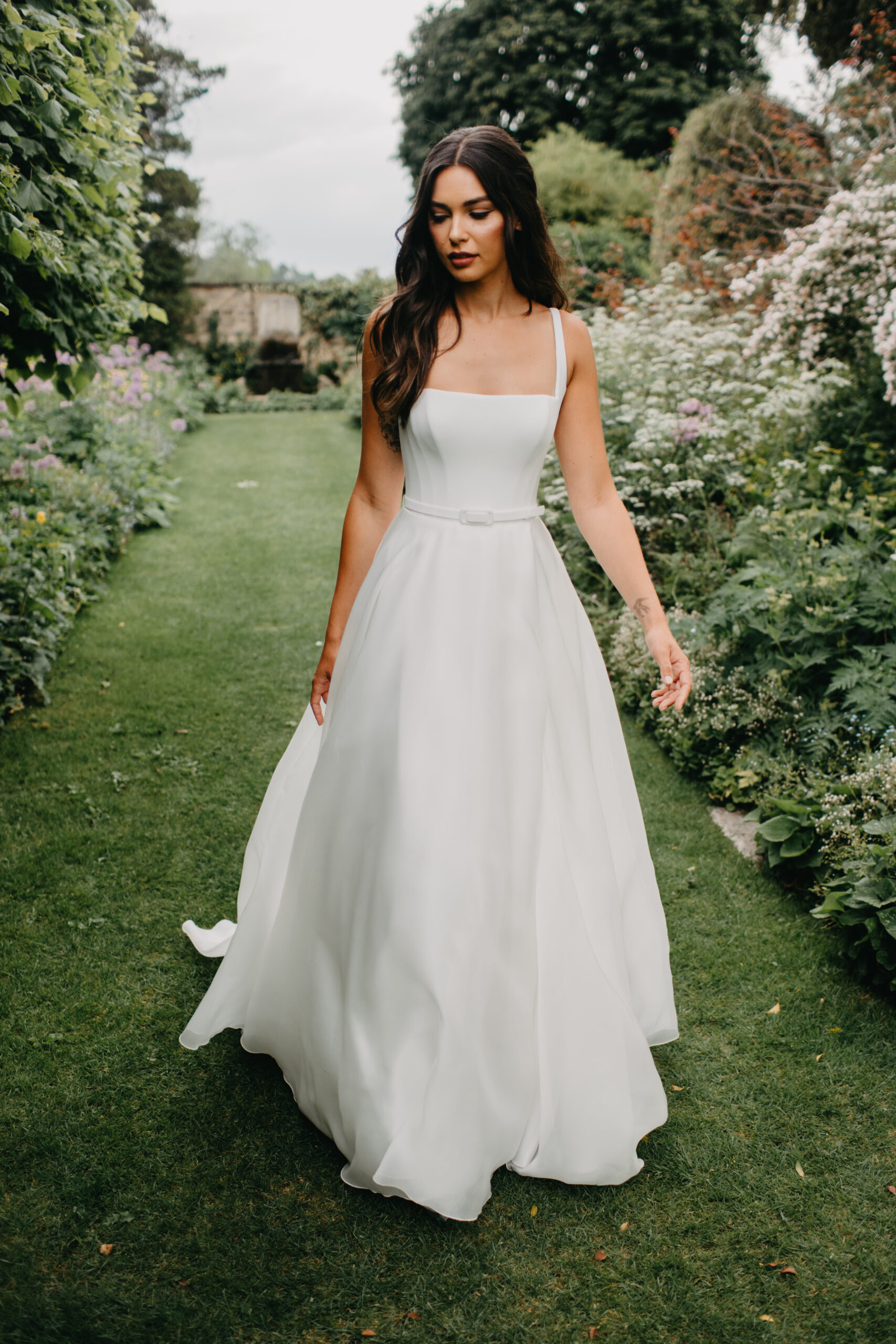 ‘Hailey’ by Suzanne Neville is a soft satin organza wedding dress with a full a-line skirt and high side slit. Hailey’s structured square neckline and thin straps frame the bodice. The belted waist detail gives shape and defines the start of the gown’s flowy skirt.