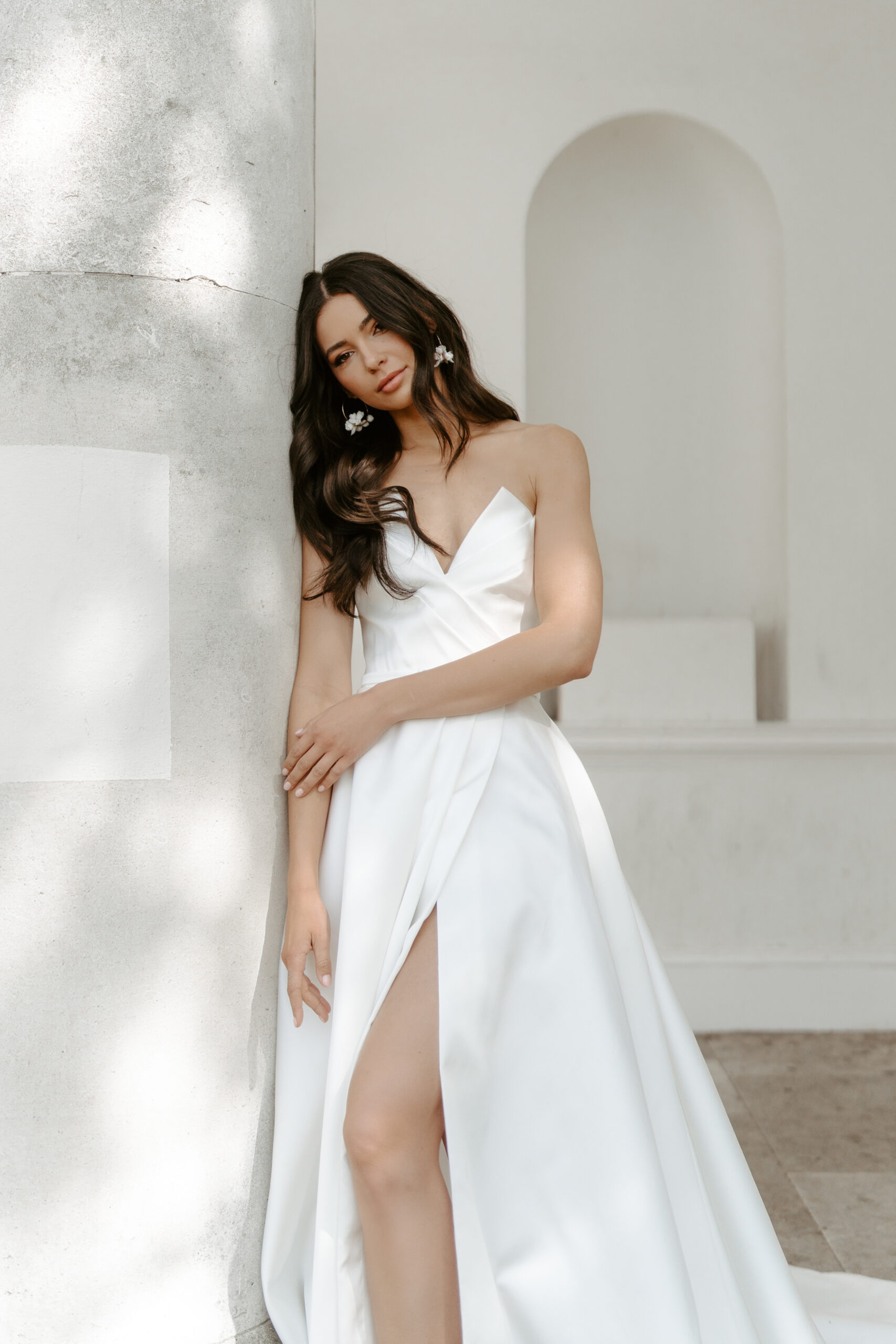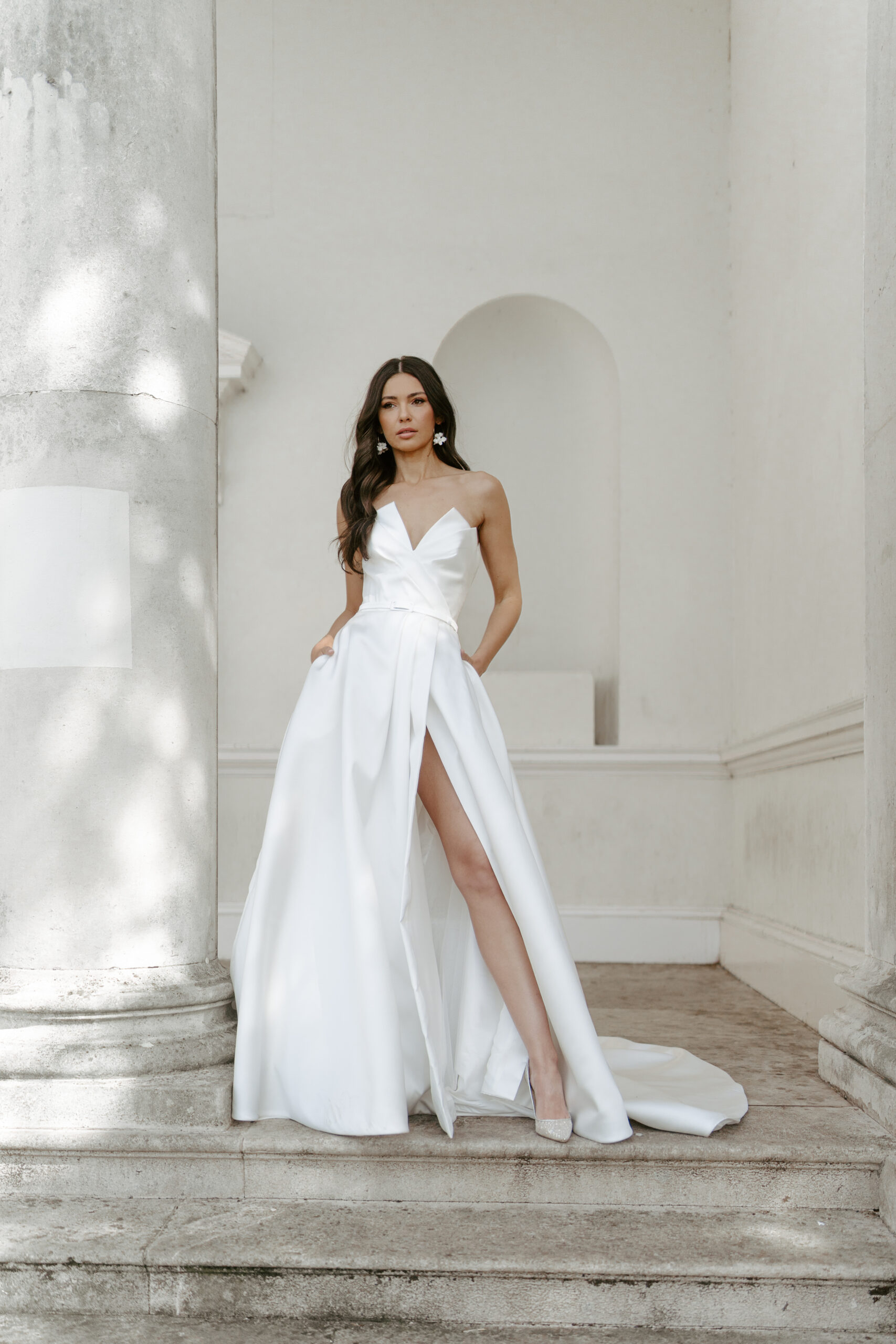 An architectural strapless a-line wedding dress with a pleated bodice detail and structured side slit, ‘Penny’ by Suzanne Neville is for the sophisticated bride that loves both simplicity and striking bridal details.