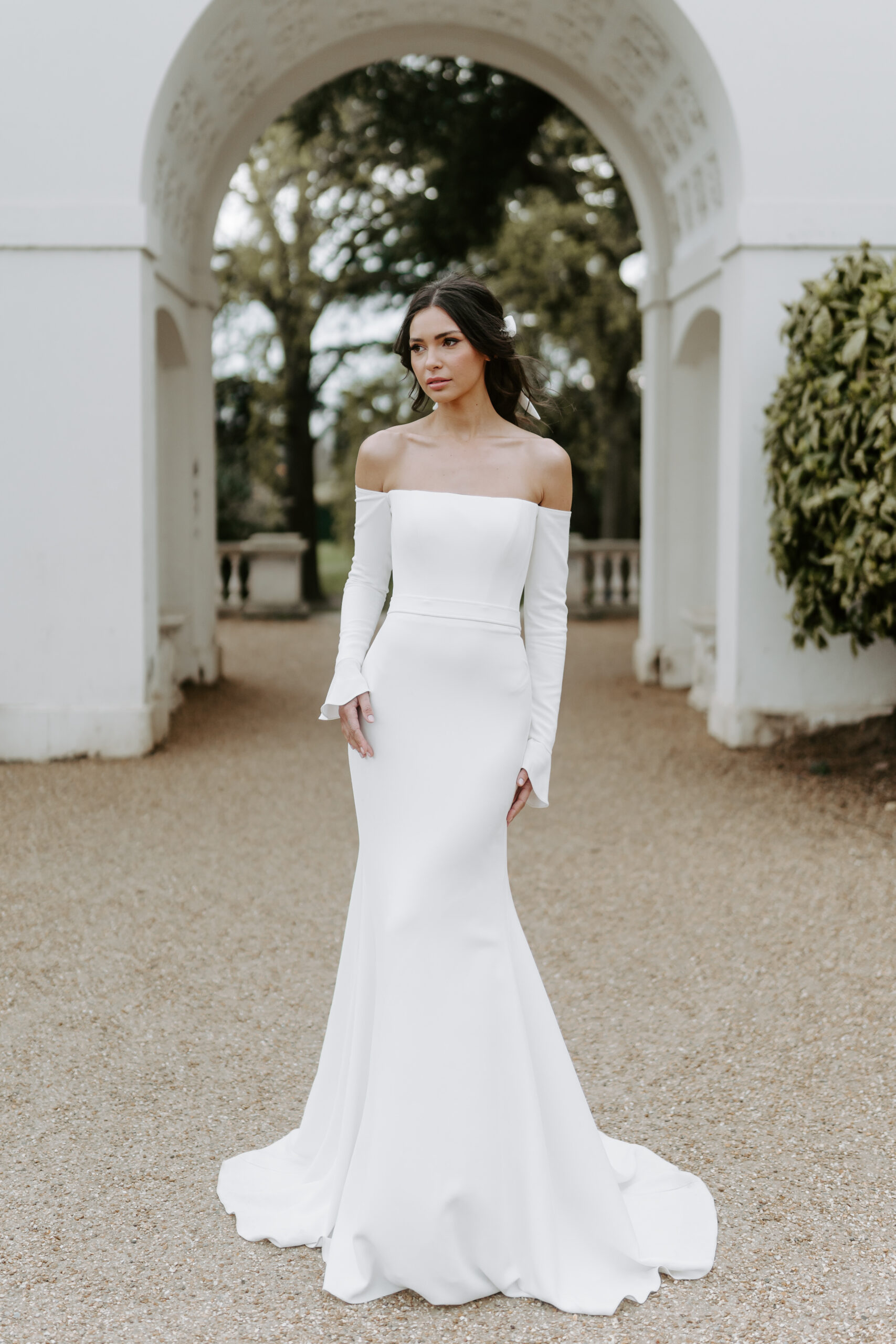 ‘Abigail’ by Suzanne Neville is a sleek simple long sleeve wedding dress that delicately demands attention. With a straight across neckline and long off-the-shoulder fitted crepe sleeves, Abigail’s simplistic allure is soft and elegant.